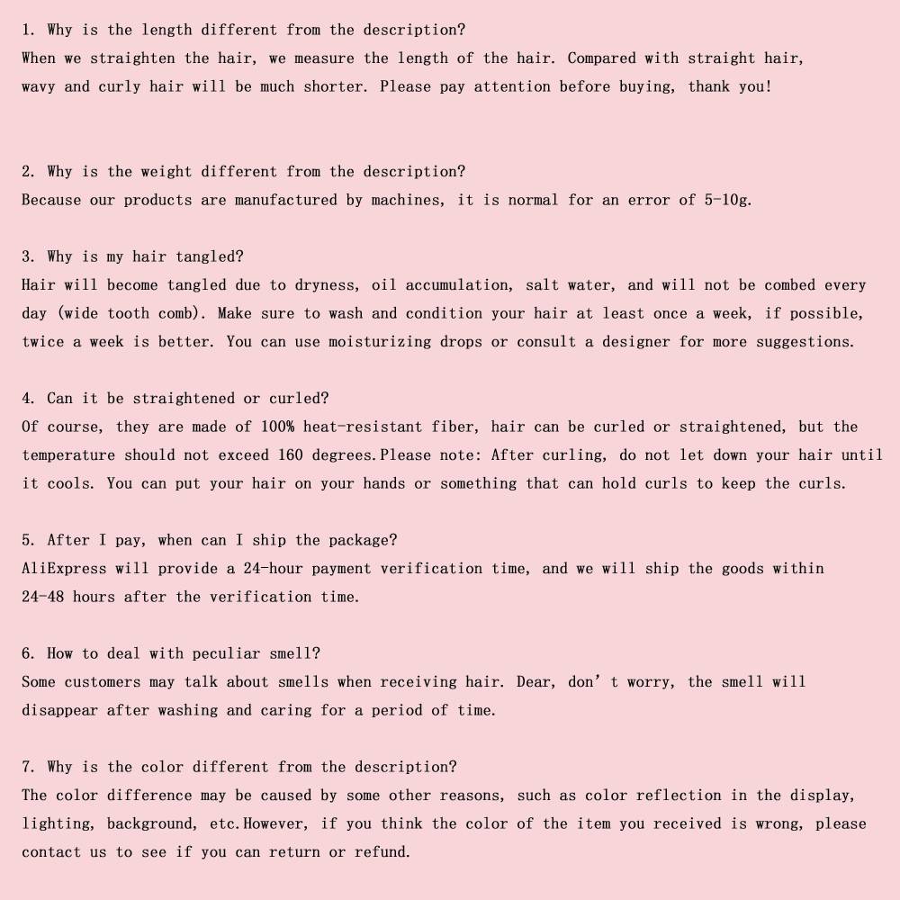 ★Обратите внимание: как и все Искусственные парики, статическое электричество и влажность могут привести к запутыванию волос. Используя продукты, которые смягчают волосы, текстура наращивания волос остается гладкой. При запутывании Используйте широкий гребень для волос, чтобы расчесать снизу хвоста.