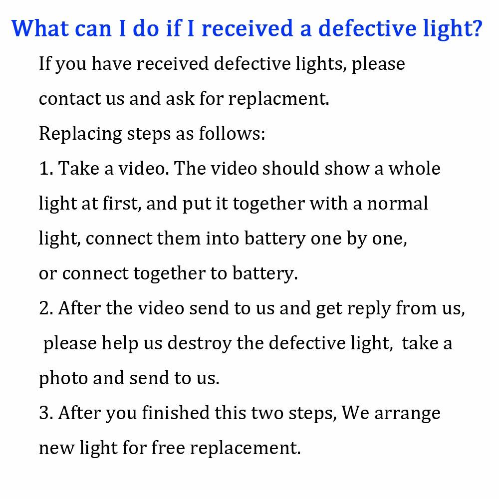 ГарантияМы предоставляем 12 месяцев гарантии на все товары с даты доставки.Если у Вас возникли какие-либо проблемы, пожалуйста, предоставьте доказательства, если ваш свет неисправен, например, фотографии, видео.Возможен обмен или замена только дефектного товара.Если товар неисправен в течение 1 года, мы предложим замену без дополнительного зарядного устройства (включая стоимость доставки) после получения дефектного товара,Покупатель должен оплатить стоимость доставки для возврата.Мы не несем ответственности за любые повреждения и потери покупателя, превышающие сумму заказа, которую покупатель фактически заплатил нам.