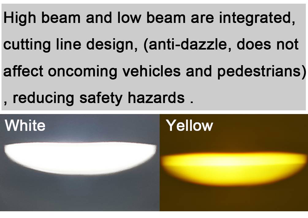 -Два цвета: Есть два цвета в одном светильник, 6000k белый свет и 3500k желтый луч, может быть более функциональным в нормальную погоду, противотуманные дни и снежные дни, также некоторые другие сложные погодные дни.