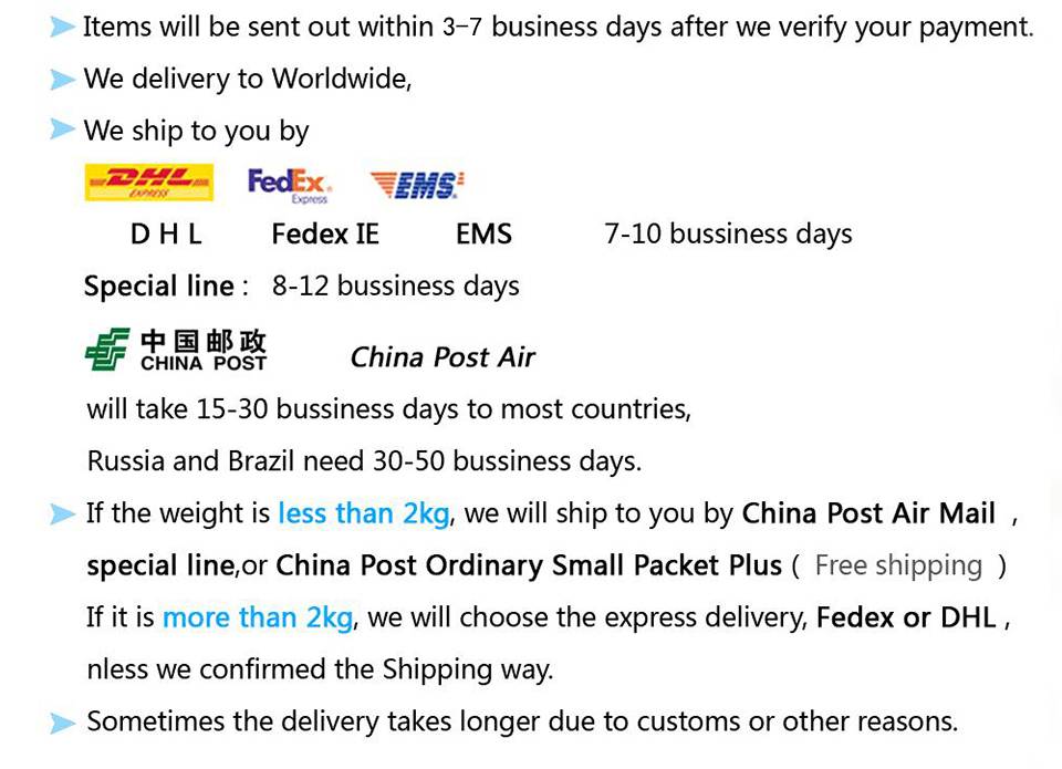 1. Пожалуйста, знайте, что мы отправим Ваш заказ в течение 3-7 рабочих дней после получения оплаты.