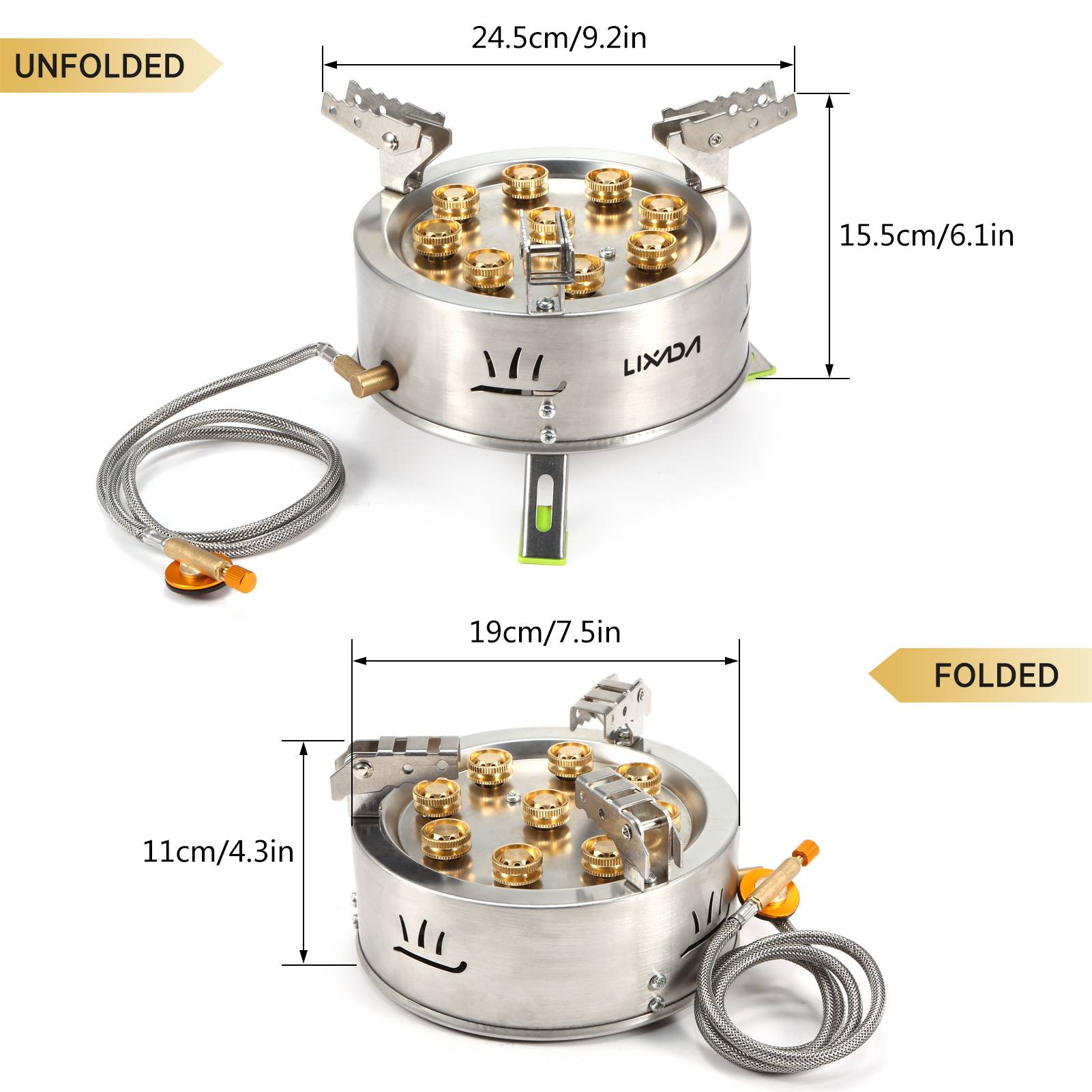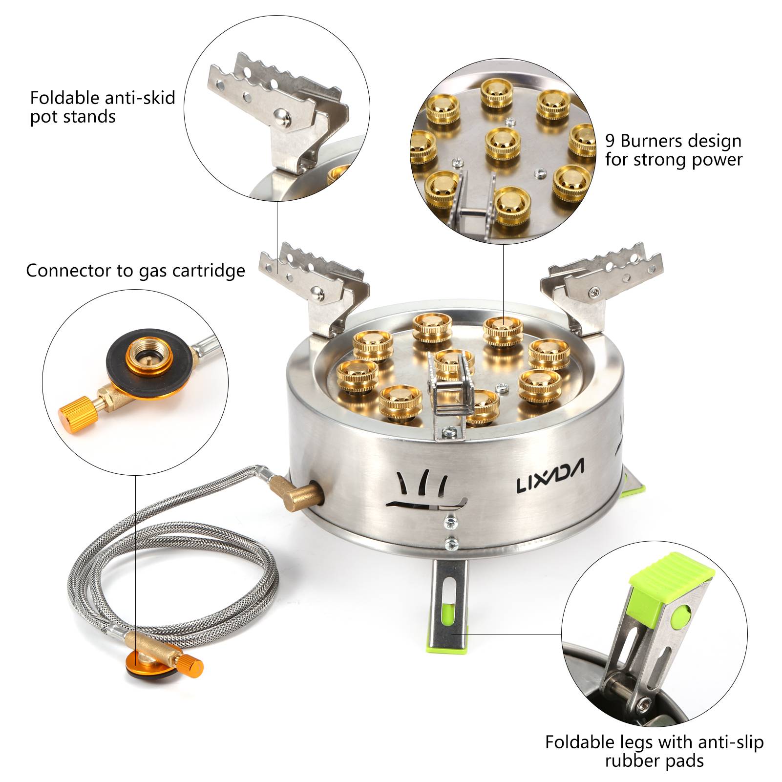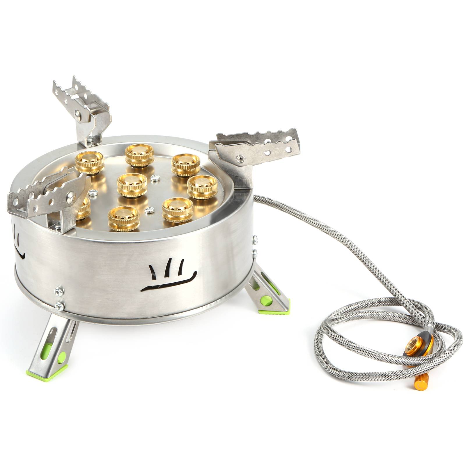 Эта уличная печь с 9 горелками, обеспечивающая мощную огненную мощность 12 800 Вт. Он изготовлен из антикоррозийной нержавеющей стали для обеспечения длительного срока службы. Складные противоскользящие подставки и ножки для кастрюль повышают устойчивость при использовании. Он идеально подходит для кемпинга, походов, пеших прогулок, пикника и других мероприятий на свежем воздухе.