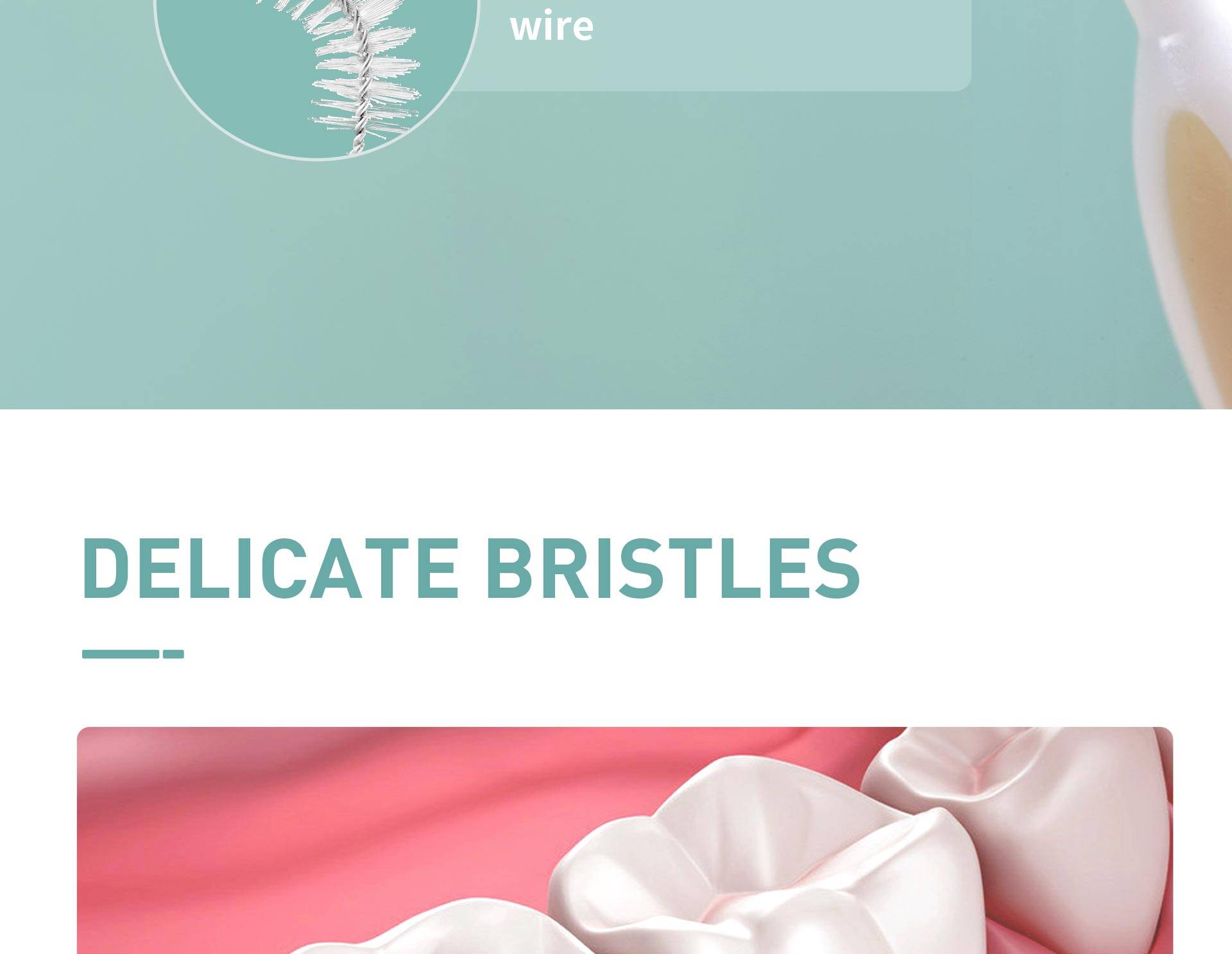 Японский импортированный эластичный стальной провод. Круглое соединение сверху сочетается с щетинками DuPont filament, гибким и устойчивым к поломке и защищает десны от повреждений. Изготовленный на заказ размер, легко очищает остатки кронштейна. Нескользящая i-образная ручка, удобная и легко удерживаемая без скольжения. Индивидуальная посылка, гигиеническая и портативная.