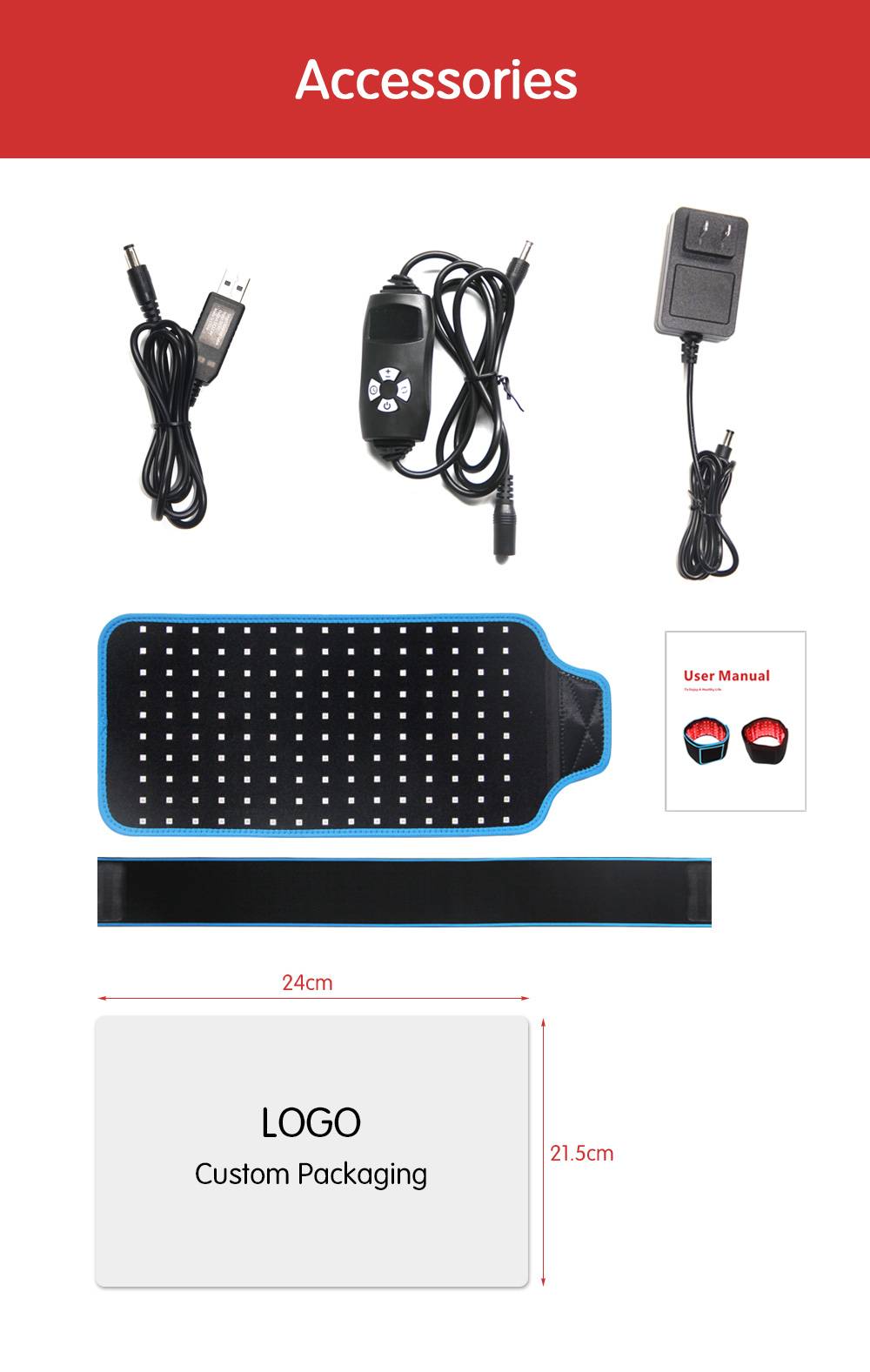 1) 150pcs 1w LED Chip2) Input voltage:100-240V AC3) External Battery : Support4) Shell Material: Neoprene5) Light denisty: >99W/m²6) Dimension: 475*200mm7) Spectrum: 660:8508) Package included: 1pcs belt + 1pcs plug with 1mcable +1pcs USB switch cable+1pcs manual+1pcsElastic band9) Gross weight: 0.65kg/pc10) Max Actual Power: 23.5W11) Optional: Black border and blue border