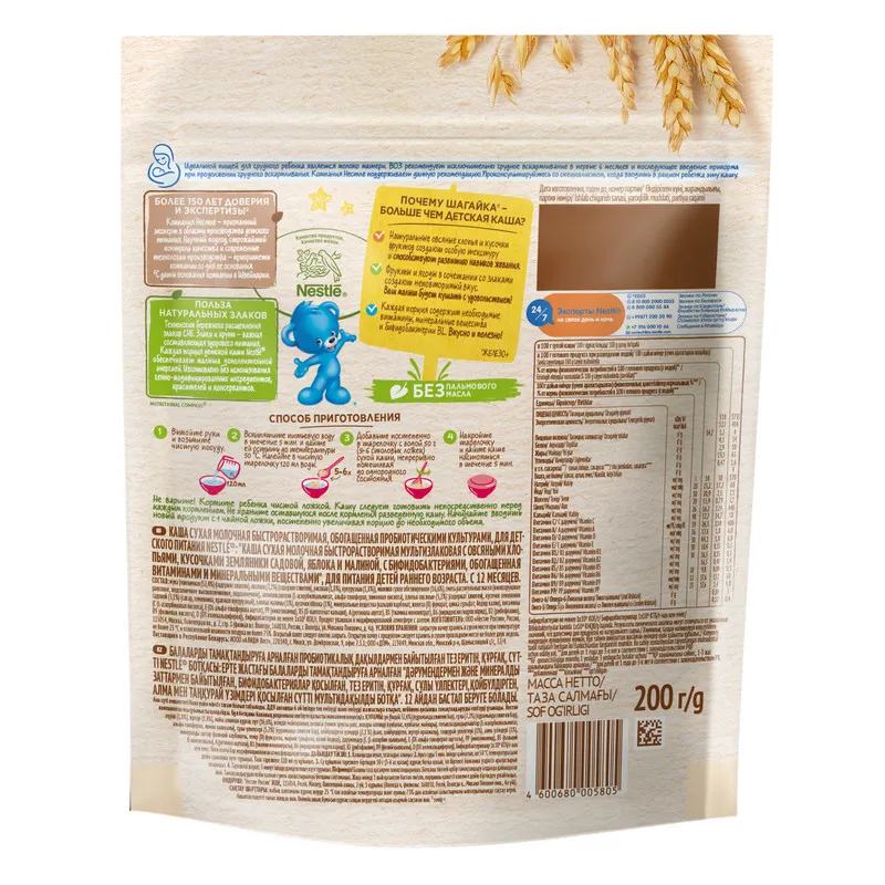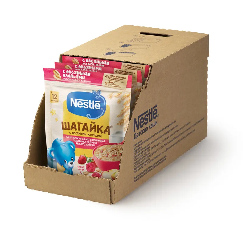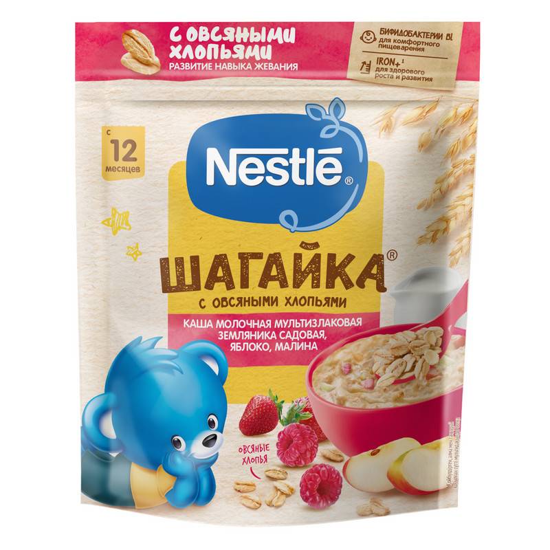 Каша Нестле шагика молоко мультфильм с овсяными хлопьями клубника сад, яблоко, малина от 12 месяцев 200 г