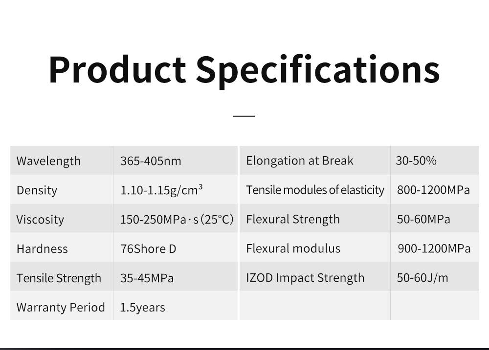 2. Предполагаемая рабочая температура составляет 18-35 °C, и низкая температура может повлиять на эффект печати, таким образом, смола может быть должным образом подогревается перед использованием (не более 60 °C).