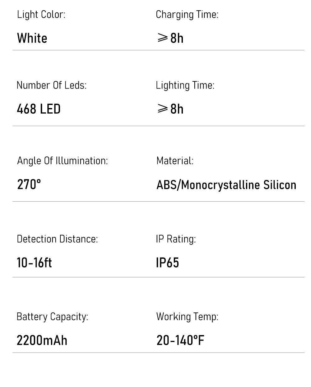 Светодиодный настенный светильник на солнечной батарее изготовлен из высокопрочного АБС-материала и имеет водонепроницаемость IP65, обладает термостойкостью и холодным сопротивлением, что позволяет использовать его на открытом воздухе. И Высокоэффективная конструкция солнечной панели, коэффициент конверсии достигает до 22%, что обеспечивает более длительное время использования.