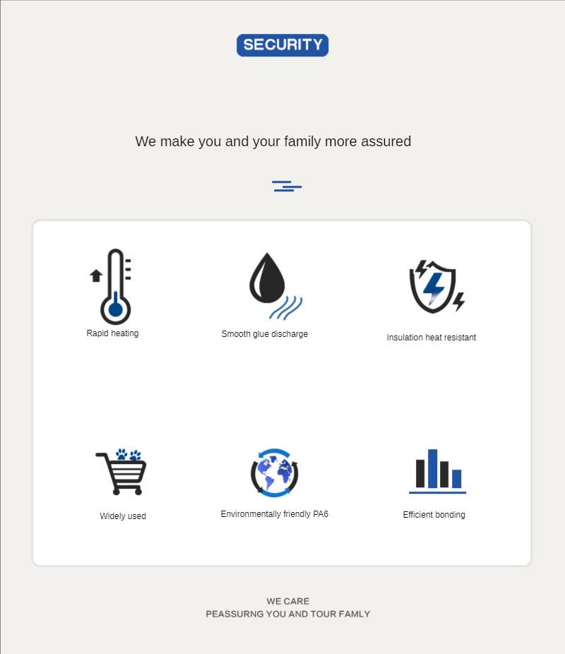 Электроплавкий пистолет принимает керамический нагревательный сердечник PTC, который имеет преимущества коррозионной стойкости, высокой термостойкости, длительного срока службы, высокой эффективности и энергосбережения, хорошей теплопроводности и быстрой скорости термической компенсации.