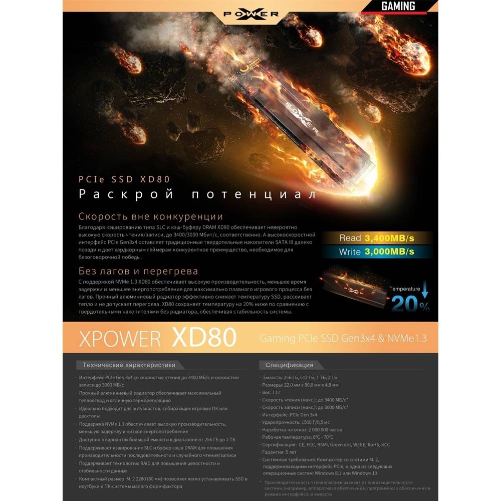 Внутренний SSD Silicon Power 256GB XD80, PCIe 3x4, R/W - 3400/3000 MB/s, (M.2), 2280, TLC 3D NAND (SP256GBP34XD8005).