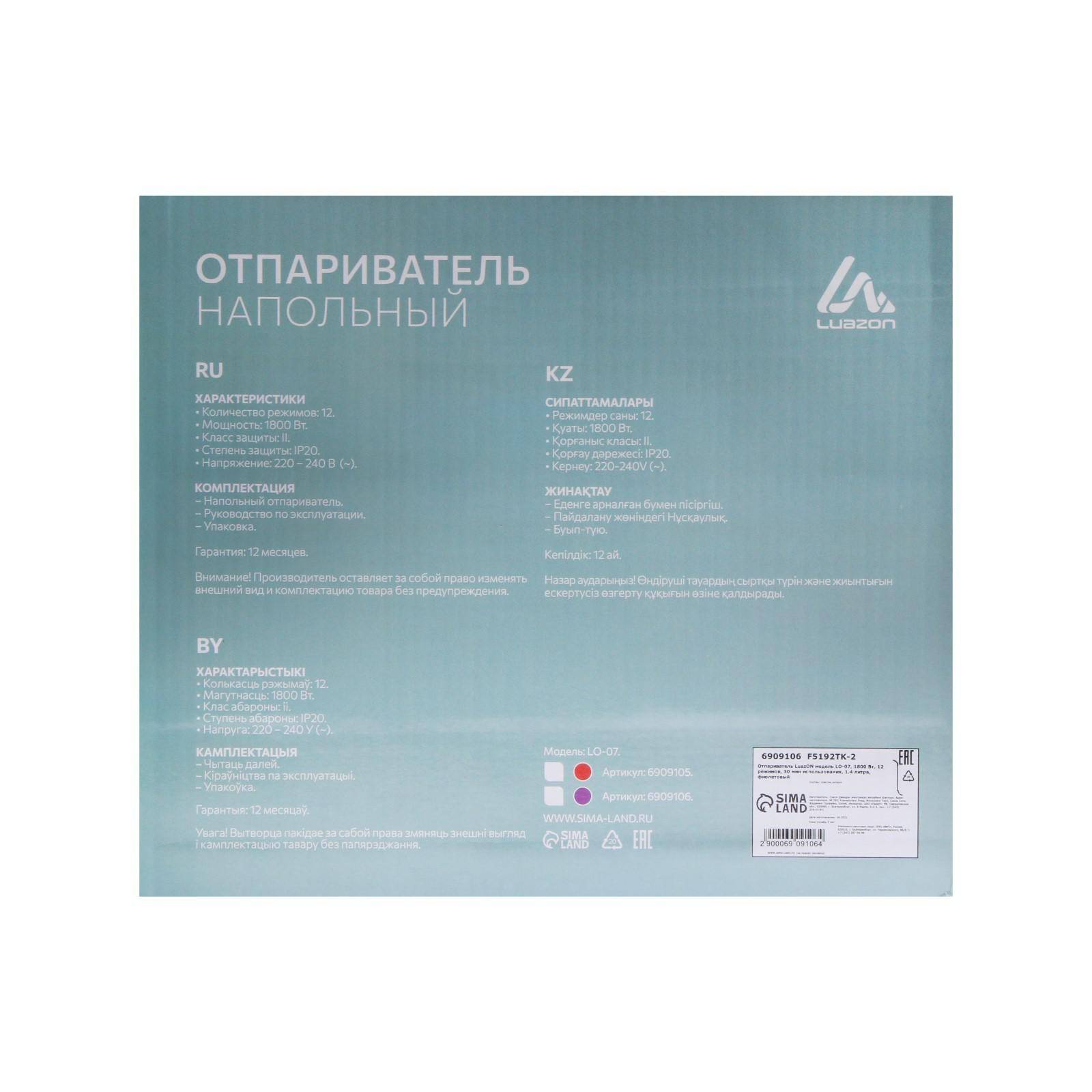 Отпариватель LuazON LO-07 поможет разгладить изделия из ткани без использования гладильной доски. Имеет регулировку интенсивности распыления пара и высоты стойки. Оснащён световым индикатором работы. Работает непрерывно до 30 минут.