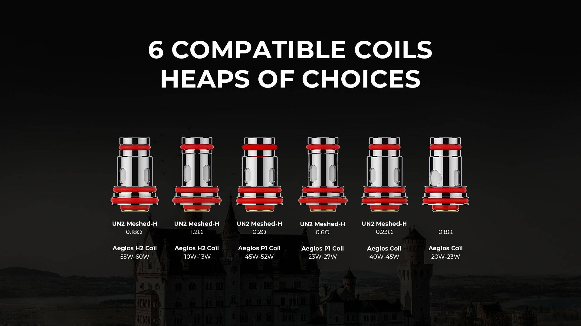 AEGLOS H2 катушка: 55 Вт-60 Вт UN2 Meshed-H 1.2Ω AEGLOS H2 катушка: 10 Вт-13 Вт UN2 Meshed-H 0.2Ω AEGLOS P1 катушка: 45W-52W UN2 Meshed-H 0.6Ω AEGLOS P1 катушка: 23W-27W UN2 Meshed-H 0.23Ω AEGLOS катушка: 40W-45W