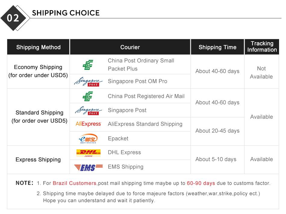 (1) Вы можете связаться с нами, если информация для отслеживания вашей посылки не обновлялась в течение длительного времени, мы можем помочь вам связаться с почтовым отделением для проверки, если ваша посылка была потеряна, мы можем повторно отправить или вернуть вам все деньги.