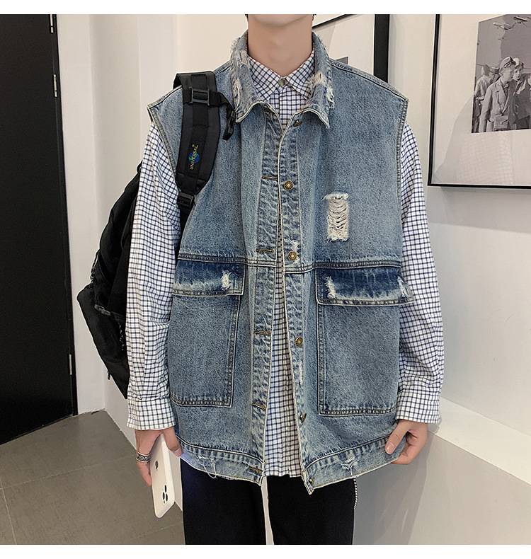 Винтажный красивый джинсовый жилет бойфренда, трендовые куртки с дырками в стиле Харадзюку, простые двойные большие карманы, универсальные ковбойские мужские пальто LFFMHMT