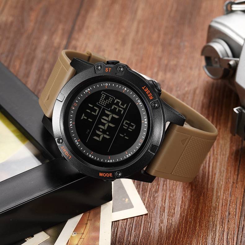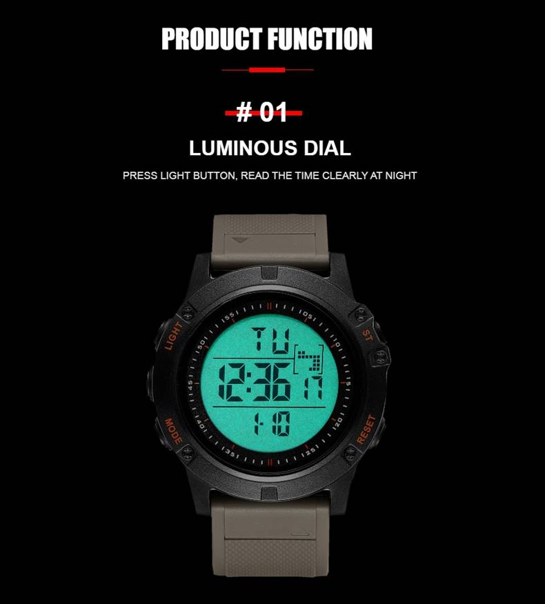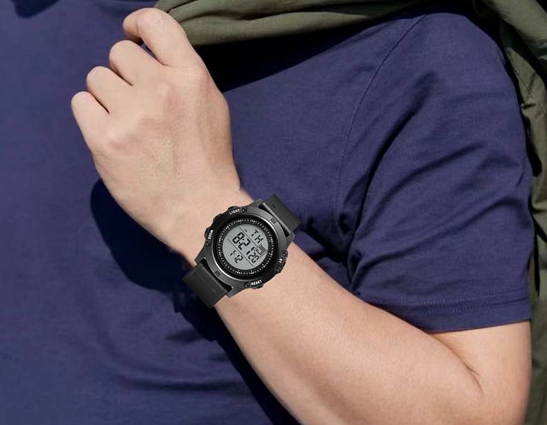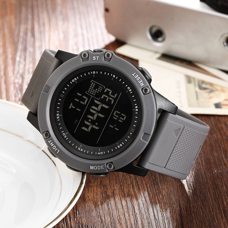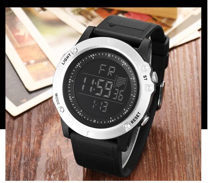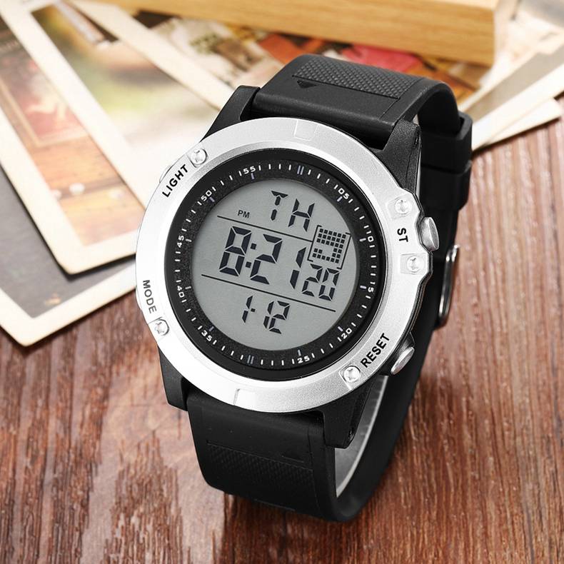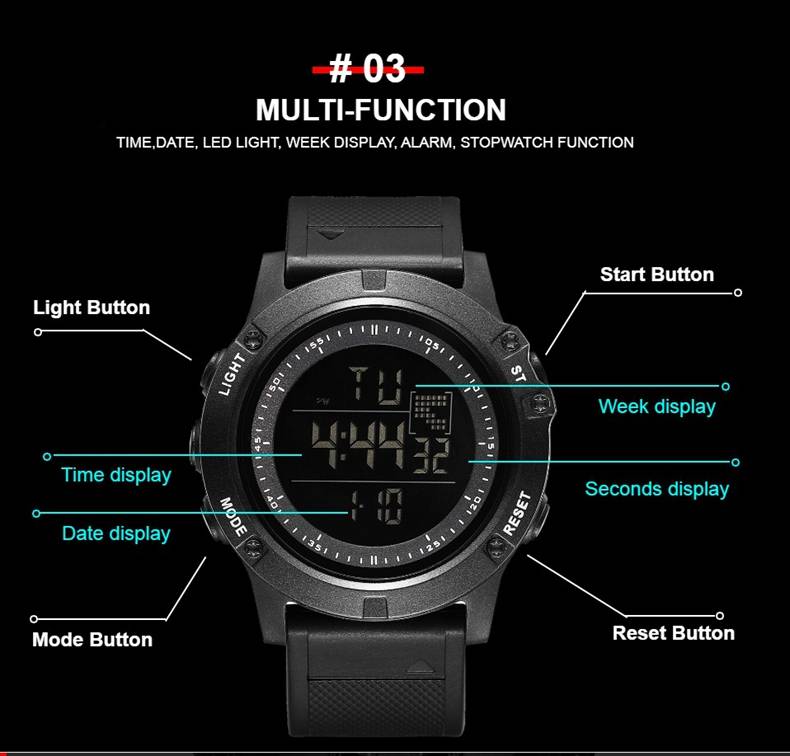 Цифровой: часы, минуты, секунды, pm, месяц, дата, день 12/24 формата отображения времени Функция будильника и ежечасного звонка Специальный дизайн с хронографом (секундомером) с шагом 0,01 секунд Водонепроницаемость до 30 м (не нажимайте кнопки в воде) Дополнительная функция подсветки ЖК-дисплея для четкого отображения времени в темноте Ударопрочность, подходит как для наружных видов спорта, так и для внутренних видов спорта