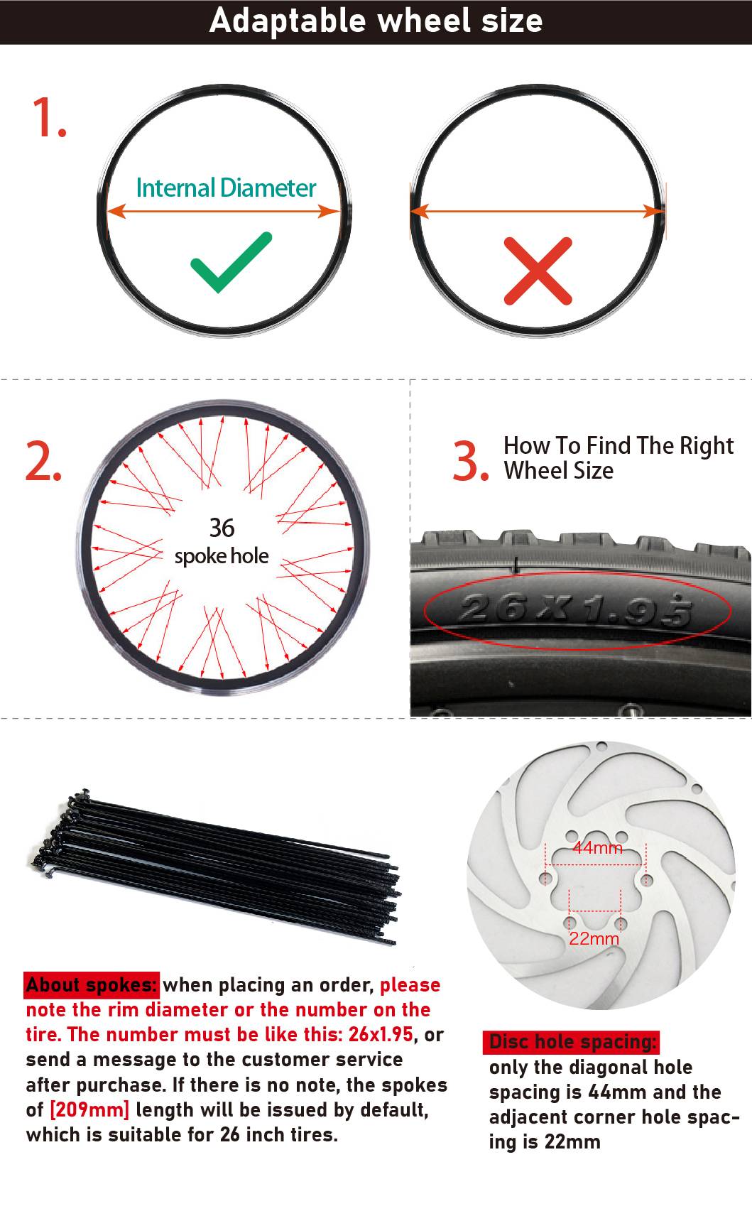 О спицах:При размещении заказа, пожалуйста, обратите внимание на диаметр обода или номер на шине. Номер должен быть таким: 26x1,95 или отправить сообщение в службу поддержки клиентов после покупки. В том случае, если нет примечание, спицы [209 мм] длина будет выдано по умолчанию, который подходит для 26 дюймов шины.