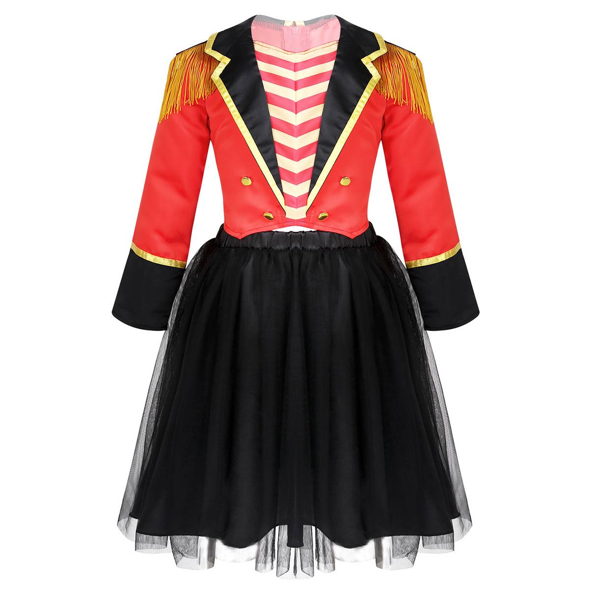 Куртка с длинными рукавами; Плечи с кисточками; Дизайн с лацканами. Дизайнерская рубашка в полоску. Украшен золотыми пуговицами. Скрытая молния сзади.