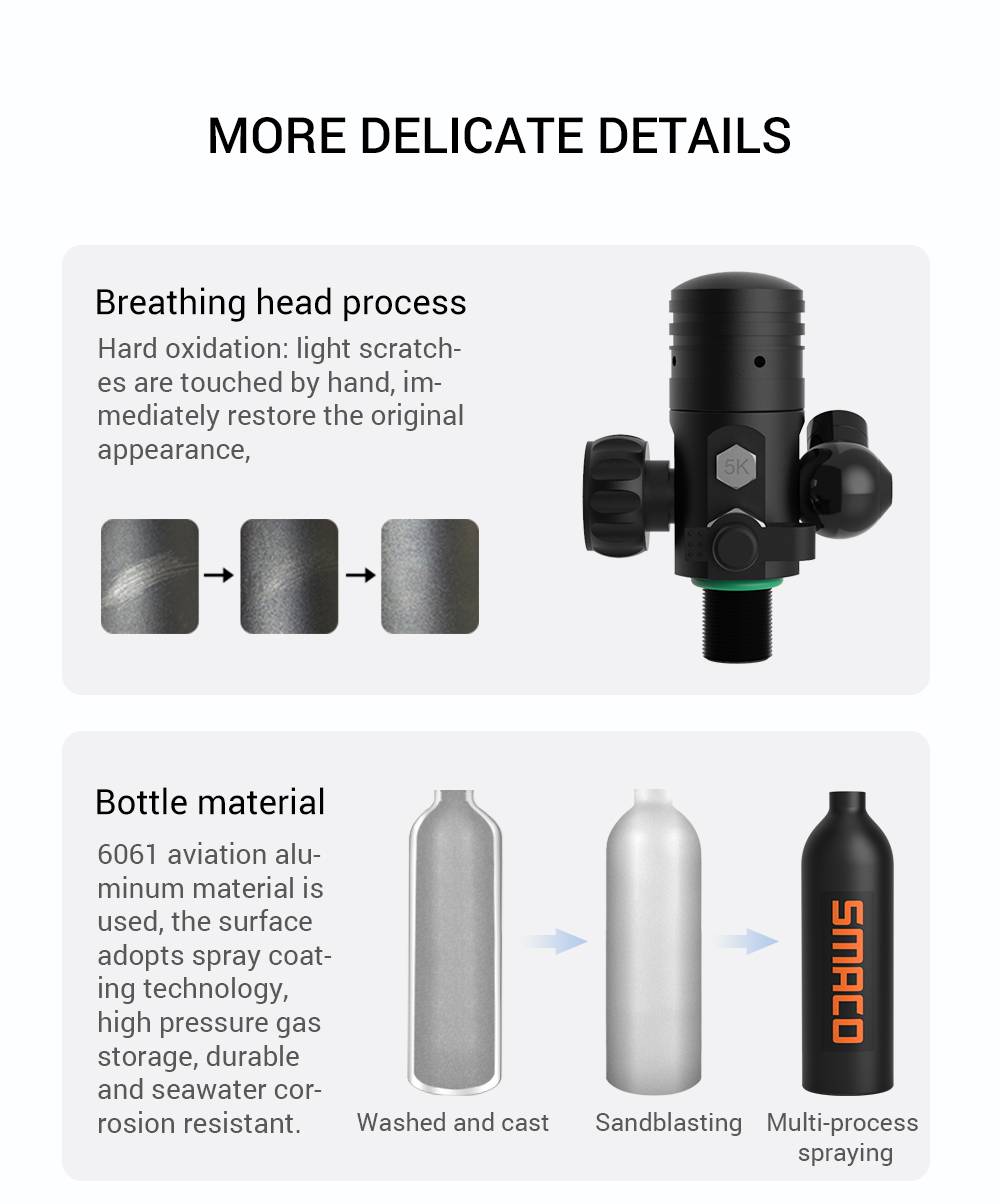 Резервуар для дайвинга изготовлен из авиационного алюминия 6061, поверхность имеет технологию распыления, хранение газа высокого давления, долговечность и устойчивость к коррозии морской воды. Интегрированный отпускной клапан имеет высокую точность и высокую стабильность, три слоя фильтрации могут эффективно защитить сердечник клапана, может эффективно организовать пыль и примеси для вдыхания. Тест-спрей для дыхательной головки в течение более 300 часов, длительный срок службы и безопасность.
