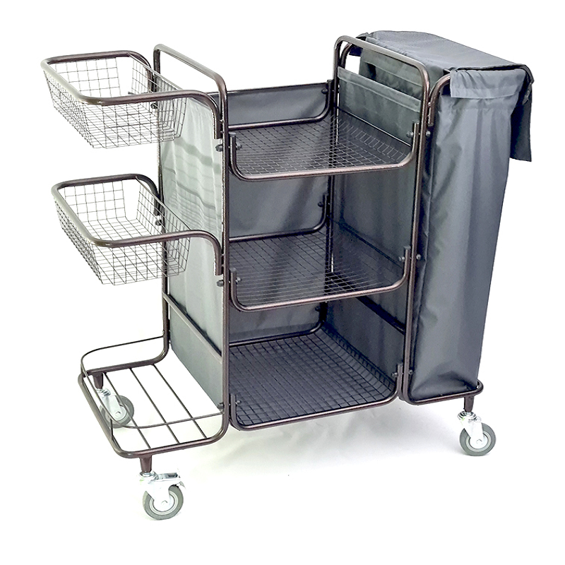 Гостиничная тележка используются для одновременного проведения всех работ по обслуживанию номерного фонда в гостиницах, отелях, домах отдыха, санаториях, палат в больничных комплексах, госпиталях. Модель тележки комплектуется тремя сетчатыми полками , мешком из высокопрочного нейлона 120 л на кронштейне.