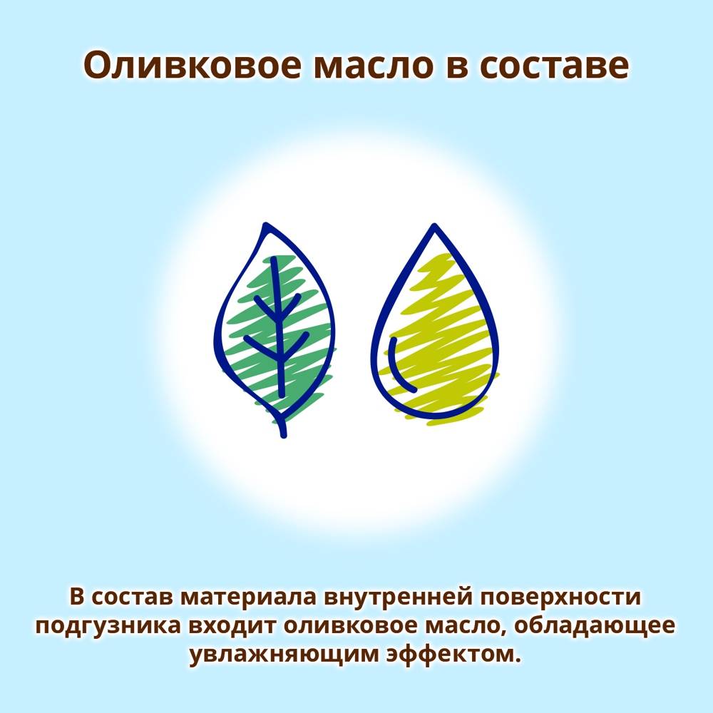 2. Оливковое масло в составе: в состав материала внутреннего слоя подгузника входит оливковое масло, защищающее кожу малыша от сухости.