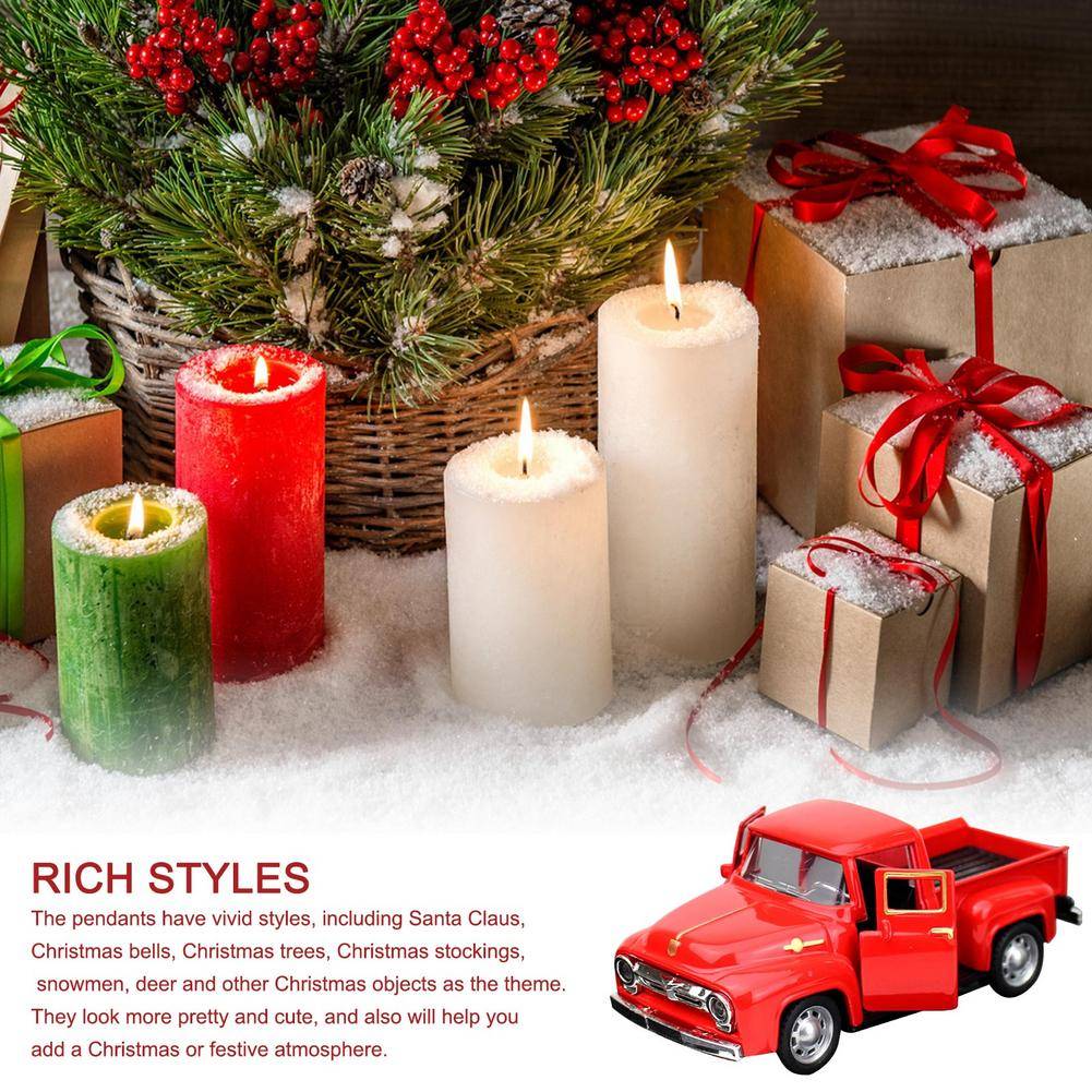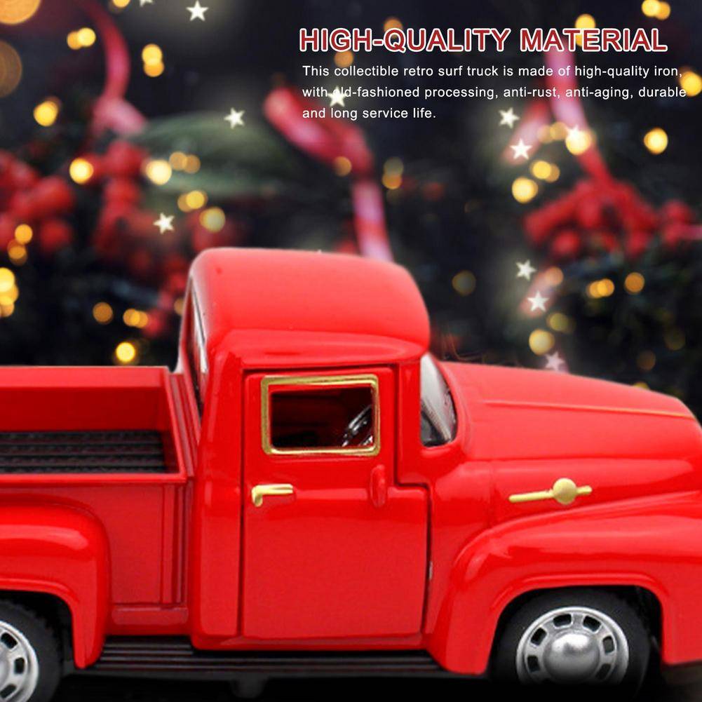 1. Универсальный орнамент грузовика: этот ретро пикап может содержать различные украшения на задней части, как вы хотите. Вы можете поместить искусственные рождественские мини-елки и мини-подарочные коробки в качестве украшения. Автомобиль также можно подвесить на рождественскую елку в качестве декоративного кулона, привнося теплую атмосферу в ваш дом. Обратите внимание, что колеса не будут кататься как автомобильная игрушка.