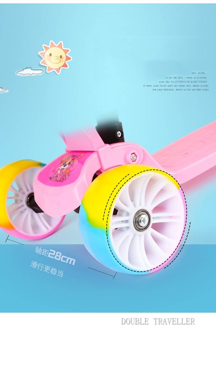 Скутер подходит для детей до 1,3 метров. Есть только один размер. Есть обычные колеса и большие цветные колеса. Размер совпадает. Педали больших колес толстые.