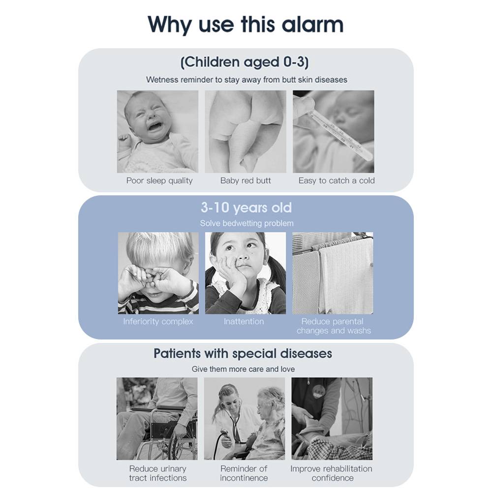 Больше любви и больше заботы о постельное белье:Этот будильник для страдающих ночным недержанием мочи детей полезен для того, чтобы держать детей подальше от заболеваний ягодичной кожи, решения проблем с увлажнением для маленьких детей и обеспечения большей заботы о пожилых людей с особыми болезнями.
