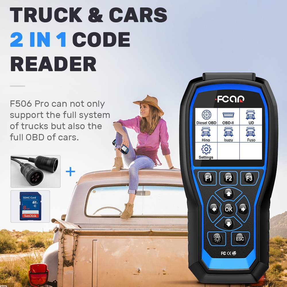 ➤【Широкое применение 】 HD Грузовики: для Freightliner, для Fuso, для GMC, для Hino, International, для Isuzu, для Iveco, для Kenworth, для Mack, для Mercedes, Для Nissian UD,Peterbilt, стерлинговое Серебро, для Western Star, для Volvo, для Allison, для Bendix, для Eaton, для Wabco, Для ZF и т. Д. И все автомобили/мин фургоны/светильник с 1996 года. Считыватель кодов F506 Pro может также использоваться как универсальный считыватель кодов OBD II для чтения и стирания кодов на БД-системе других марок.
