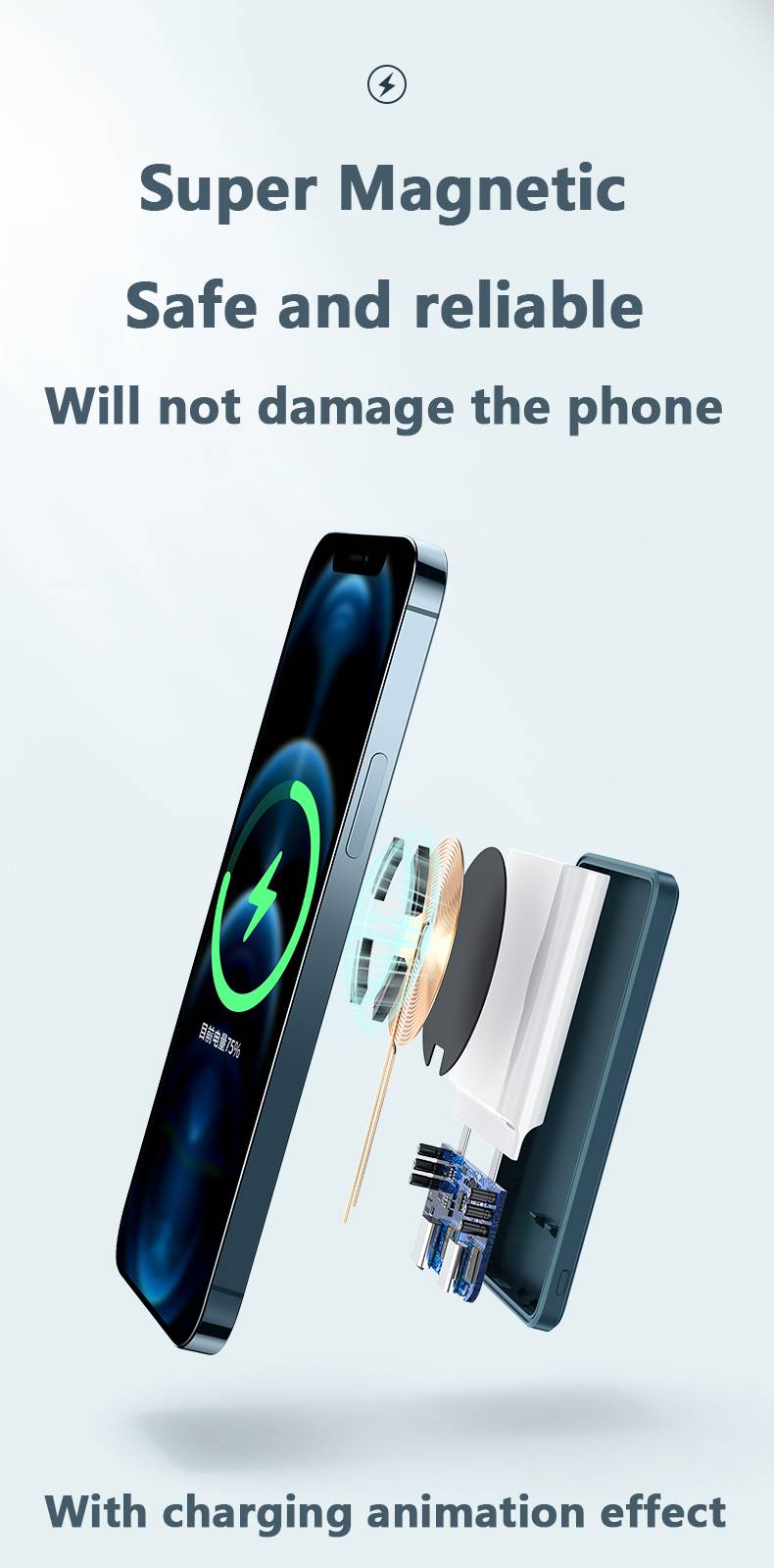 Небольшой и компактный сильный магнит, который удерживает телефон, беспокоясь о том, что он выпадает. На iPhone 12's. USB-C также может заряжать другие устройства через кабель. Имеет анимацию магнитной зарядки.