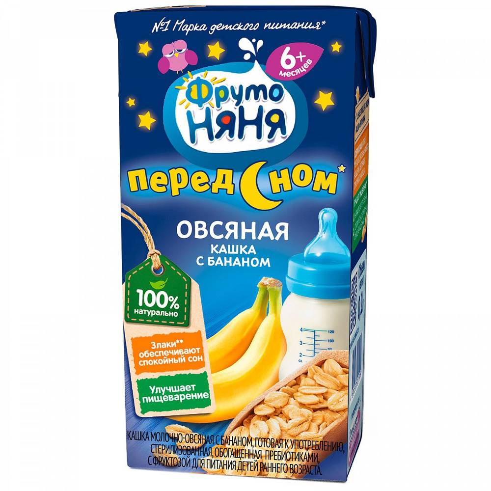 Кашка ФрутоНяня «Перед сном» молочно-овсяная с бананом с 6 мес. 200 мл. Жидкие молочные кашки ФрутоНяня содержат злаки, которые обладают длительным эффектом насыщения, обеспечивая спокойной сон малыша. Овсяная крупа богата калием, фосфором, магнием, железом, фтором, цинком, йодом. Отличается высоким содержанием витамина Е и группы В. Польза овсяной каши заключается в большом количестве легкоусвояемых углеводов. Пребиотики, входящие в состав кашки, способствуют росту полезной микрофлоры. Банан обогащает кашку калием и углеводами.
