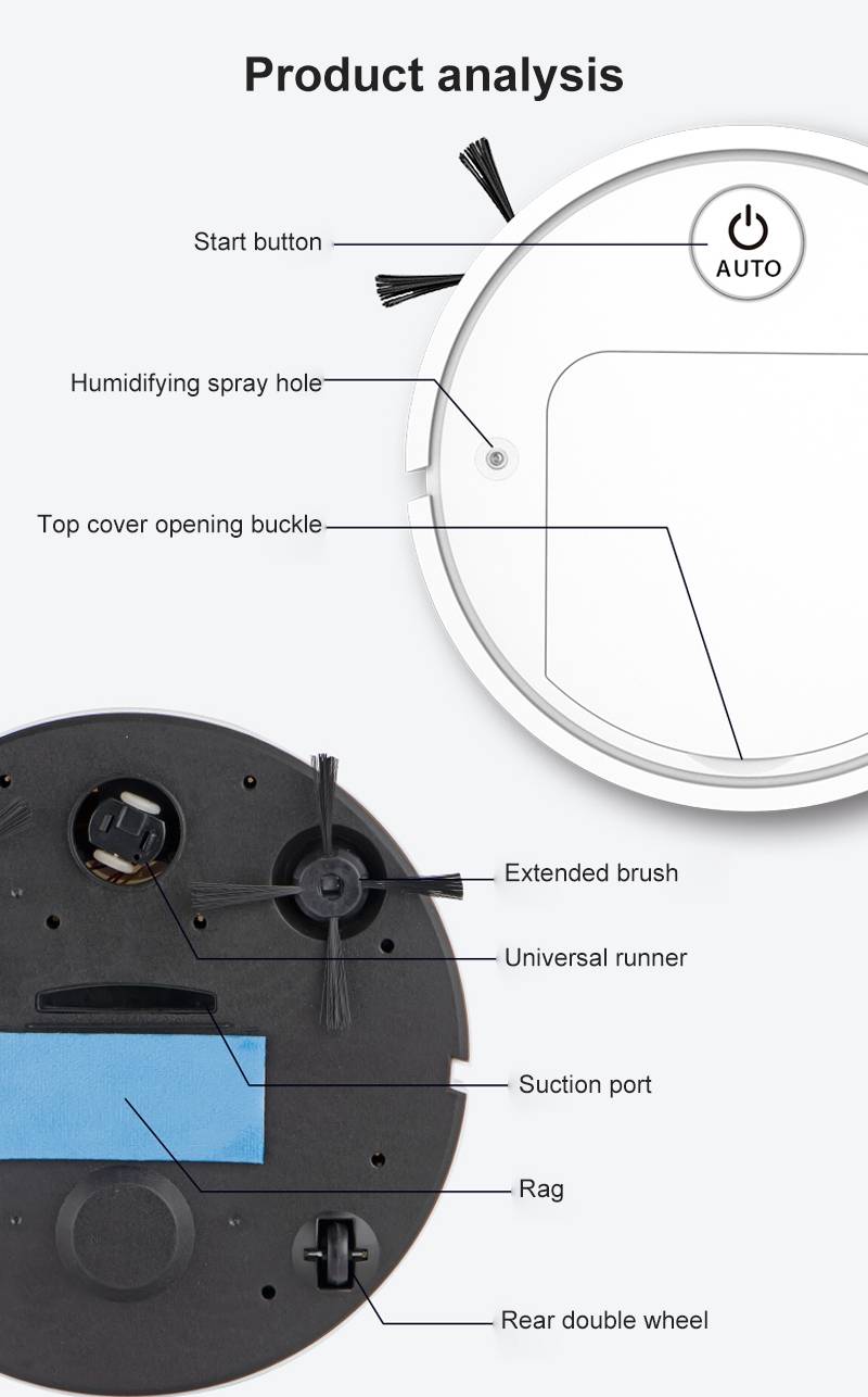 2. Интегрированная всасывание, подметание и измельчение, высокая эффективность очистки гарантируется; Одна кнопка начинает автоматически весь дом, в сочетании с всасыванием три в одном, подметание и измельчение, очистка очистки.