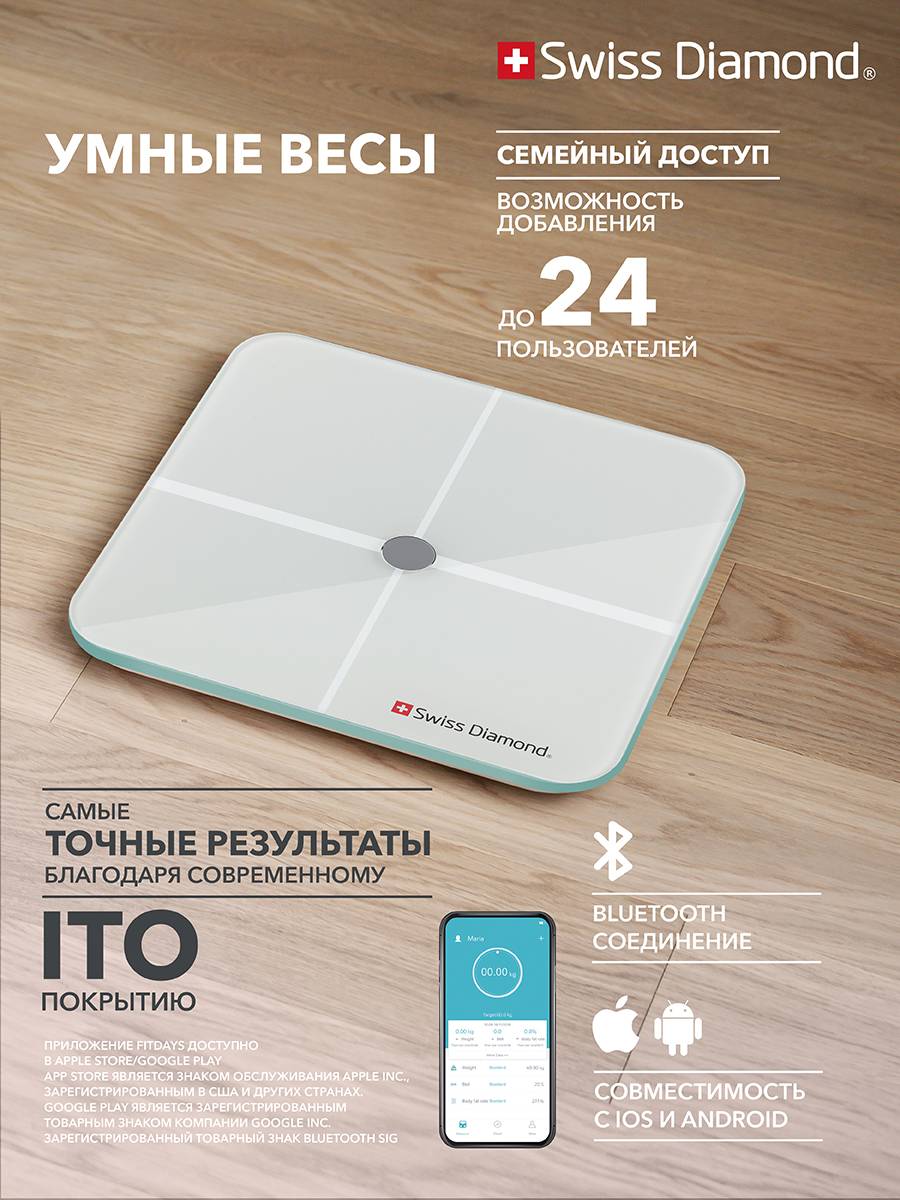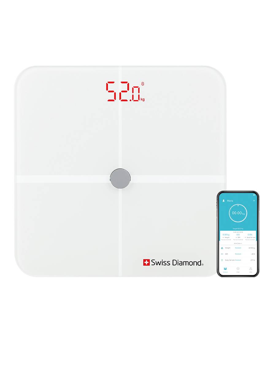 Весы диагностические напольные Swiss Diamond SD-SC 002 W синхронизируются со смартфоном. Совместимые операционные системы: IOS 8.0 и новее, Android 5.0 и новее.