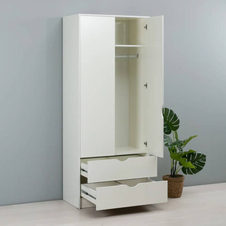 Гардероб поможет оснастить светильник и яркую комнату. Верхний отсек для одежды оснащен штангой. Нижний отсек шкафа дополнен двумя ящиками с внутренними перегородками, что значительно улучшает организацию хранения. Фасады украшены вырезанными ручками, неоспоримое преимущество которых заключается в том, что никто не поймает и не ударит. Шкаф имеет теплый белый оттенок и светильник с текстурой древесины. В комплект входят подробные инструкции по сборке и все необходимые крепежи.