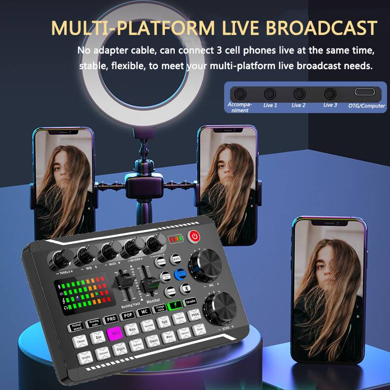 2. Многофункциональная звуковая карта настройки, полные функции, простая работа, простота в использовании, встроенный литиевый аккумулятор. Универсальный для мобильных телефонов и компьютеров.