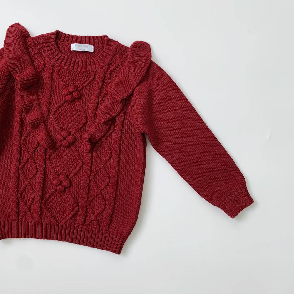 Кружевной свитер с оборками для девочек; Сезон осень-зима; Милый дизайн с помпоном; Пуловер с длинными рукавами для маленьких девочек; Одежда; Топы; Детская вязаная одежда