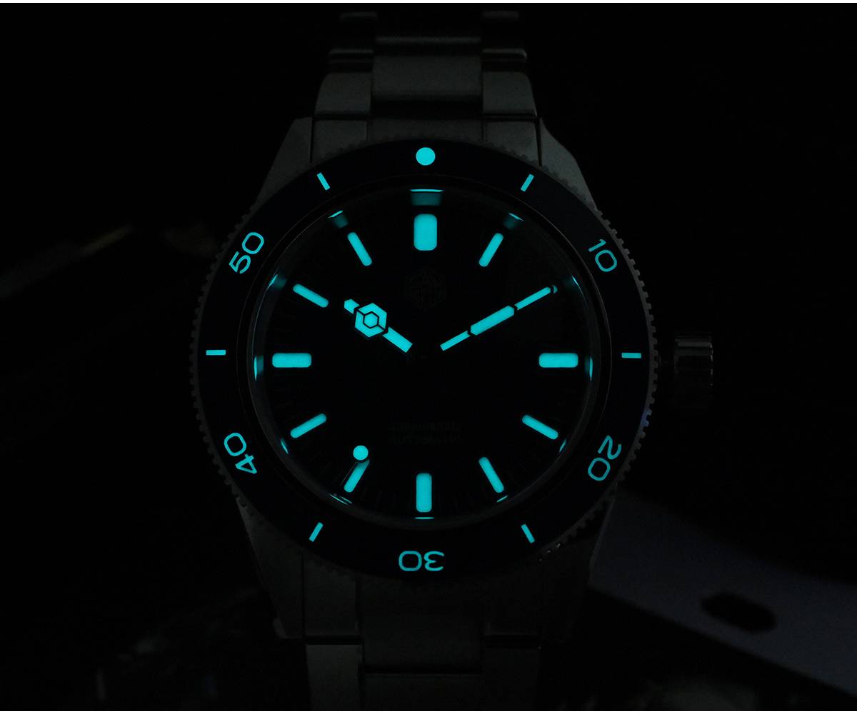 Рамка: 120 нажатий однонаправленный хронограф ободок, керамические верхнее кольцо, 12 часов световой маркеры