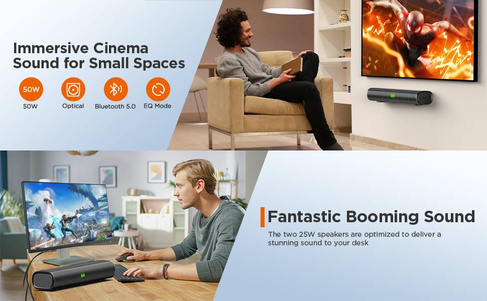 Экономия пространства и мощность: ВзвешиваниеВсего 2 фунта (~ 900 грамм)Тонкий, мощный светильник. Оснащен2 пассивных радиатора и 2 полнодиапазонных динамика обеспечивают максимальную мощность до 50 ВтКоторыеВ 5 раз мощнееЧем большинство мини-динамиков 2x5-watt, вам не нужно беспокоиться о недостатке звука и басов.