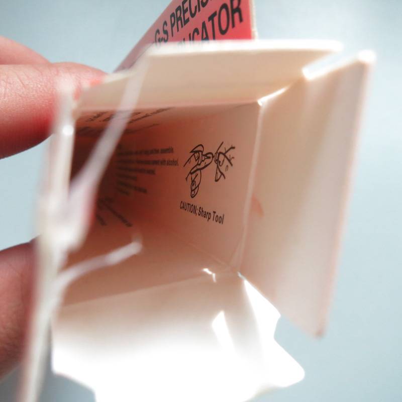 Полное использование наконечника прецизионного аппликатора поддерживается путем вставки провода колпачка в трубку, когда она не используется, и путем очистки лишних капель снаружи аппликатора с помощью протирания спирта или удаления лака для ногтей.