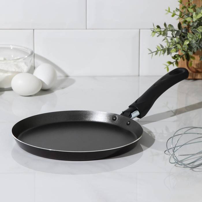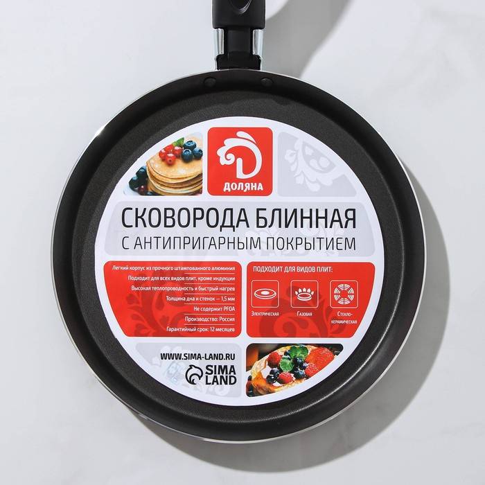 Блинная сковорода из прочного штампованного пищевого алюминия станет незаменимым и надежным помощником на вашей кухне. На специальной качественной сковороде для блинов Доляна блинчики получаются пышные и вкусные, а процесс приготовления не отнимает много времени и сил!
