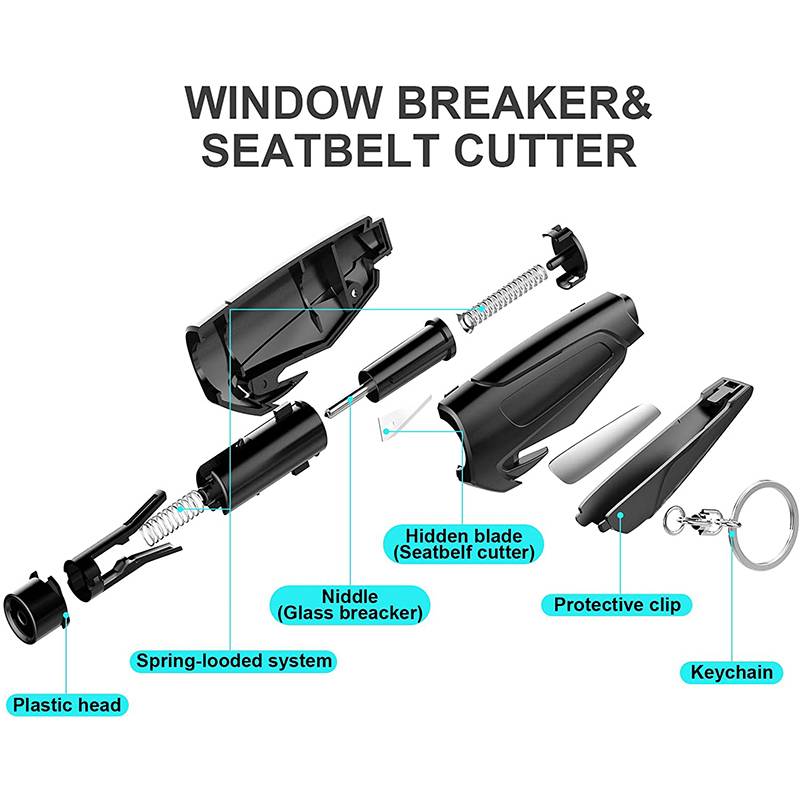 Он имеет металлический молоток для разбивания окна вашего автомобиля в чрезвычайной ситуации