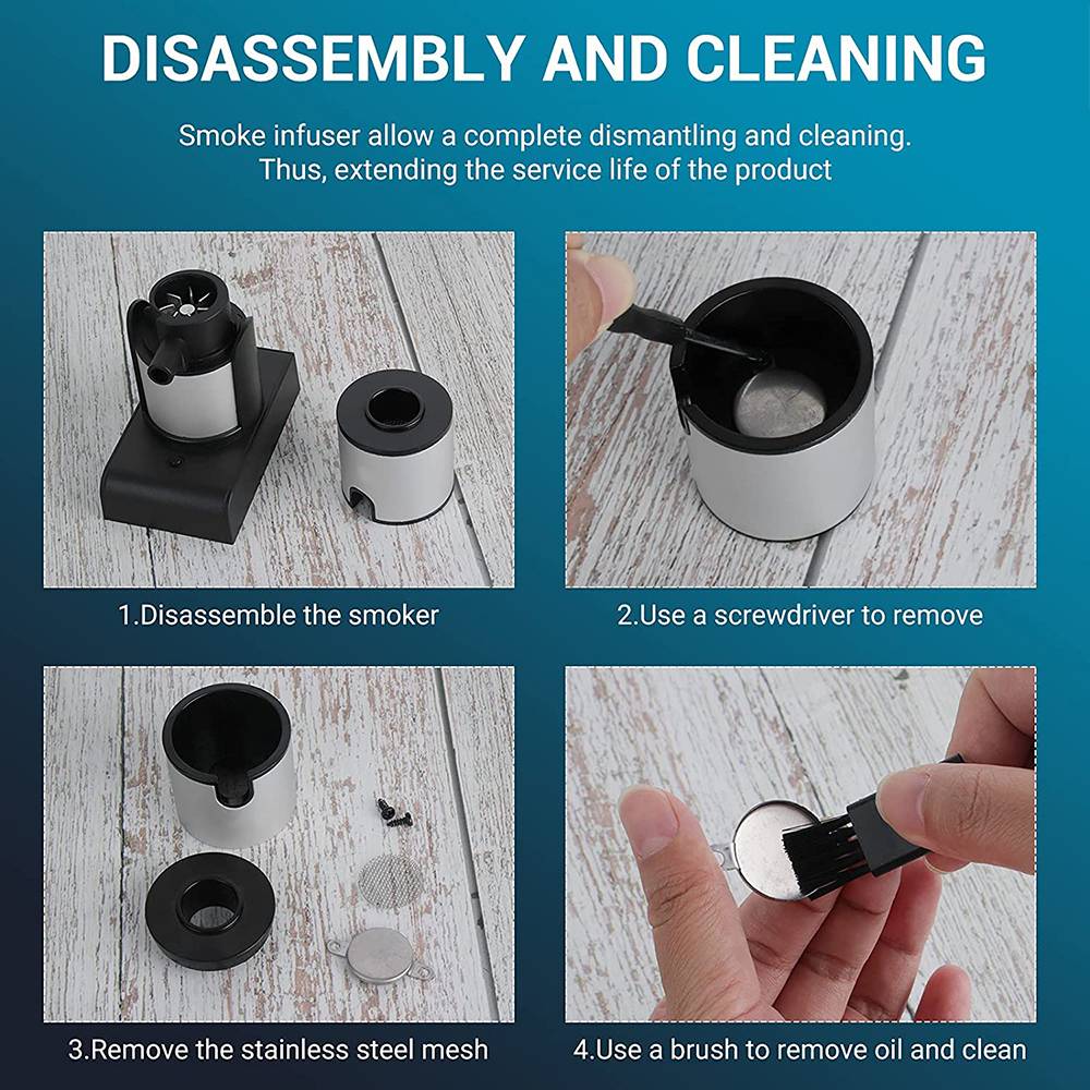 5. Простота в обслуживании: вам нужно часто чистить камеру сгорания вашего электрического холодного курильщика. После каждого использования протрите влажной тканью и высушите ее должным образом. Его можно собрать или разобрать без инструментов. Легко чистить, протирая или поливая, но не рекомендуется использовать посудомоечную машину. Легко носить с собой, подходит для барбекю, пикника, приготовления пищи