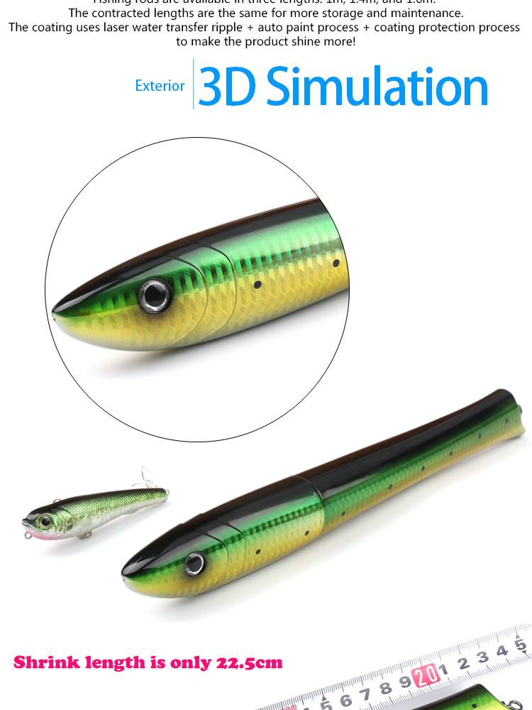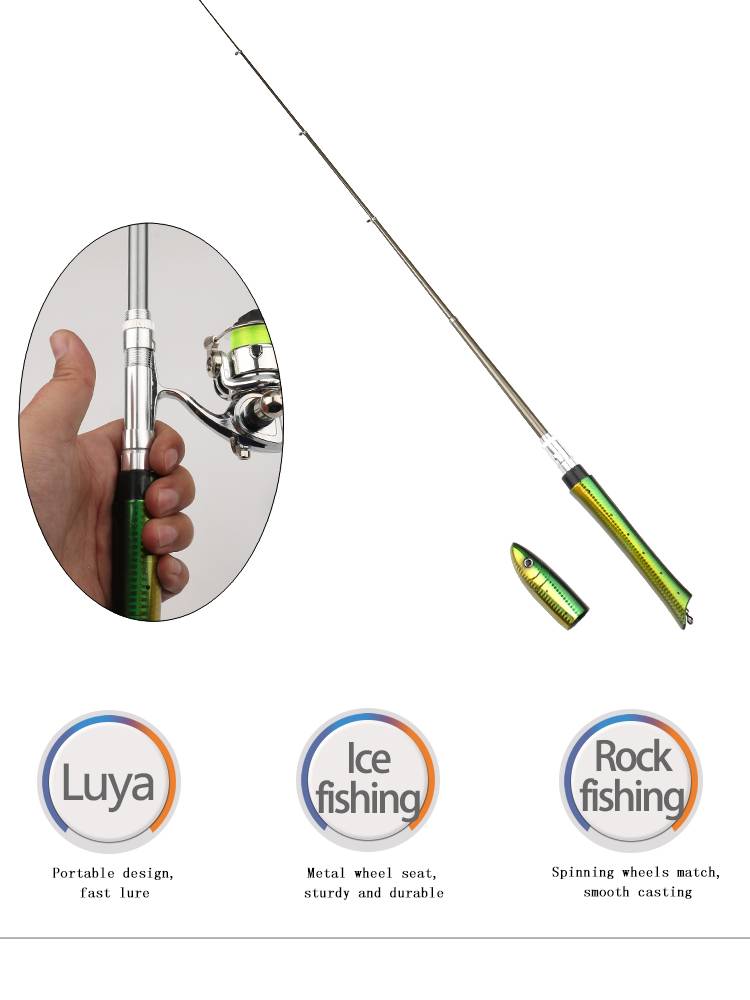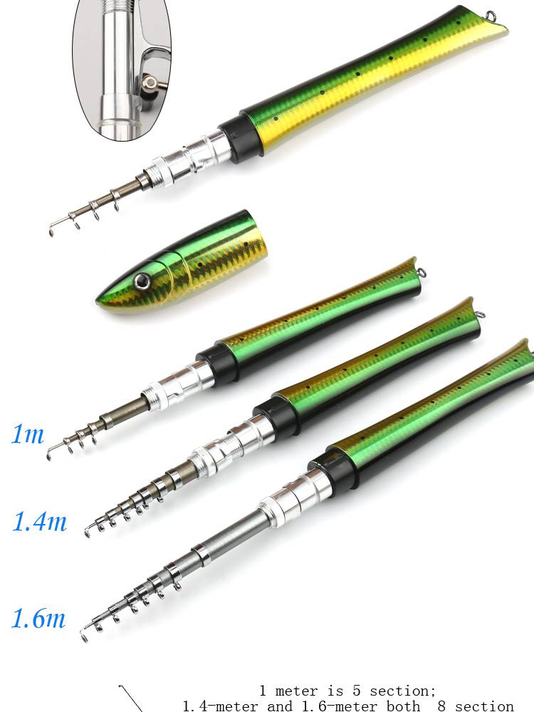 В Удочка доступен в 1,4 метров и 1,6 метров в длину, и усадка длина одна и та же, которая больше места для хранения и технического обслуживания; покрытие принимает лазерную передачу воды пульсация + процесс окраски автомобиля + процесс защиты покрытия, чтобы сделать продукт более сияющим!