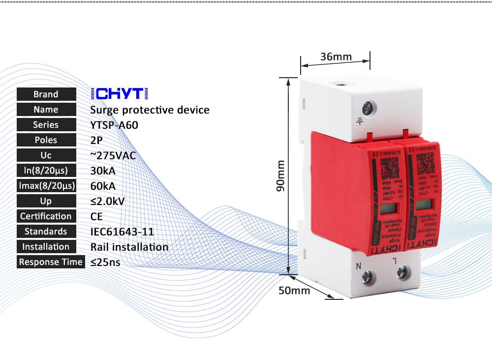 YTSP серии Устройство защиты от перенапряжения (короче сглаживатель перепадов напряжения, alias: Варистор молниеотвод) подходит для TN-S, TN-C-S, T/T, и т. д., источника питания системы переменного тока в переменного тока, 50/60 Гц,<380 В, установлен на стыке LPZ1 или LPZ2 и LPZ3. Он разработан в соответствии с IEC61643-1 GB18802.1, он принимает стандартный рельс 35 мм, на модуле устройства защиты от перенапряжения установлен сбой, когда SPD выходит из строя из-за перегрева и перегрузки по току, выход из строя поможет электрическому оборудованию отделиться от системы питания и дать сигнал индикации, Зеленый означает нормальный, Красный означает ненормальный, он также может быть заменен для модуля, когда имеет рабочее напряжение.