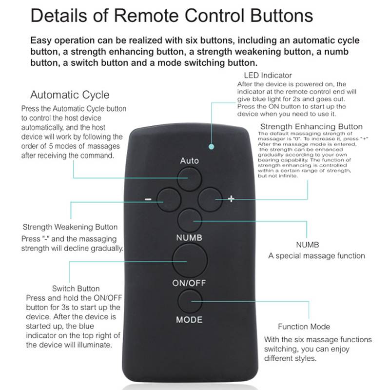 2. При включении контроллера или хоста, необходимо удерживать нажатие 3 секунды кнопки «on» или кнопки питания3. Выберите «Авто», хост будет работать 6 режимов для автоматического цикла4. "+" Увеличьте прочность, при первом включении хоста, сила равна "0", в соответствии с вашей необходимостью увеличить прочность5. "-" уменьшает прочность6. «онемение» специфическая функция для массажа7. "режим: включает 6 режимов, обмен в соответствии с вашим8. Каждый раз, когда хост получает сигнал от контроллера, светильник на нем будет мигать.