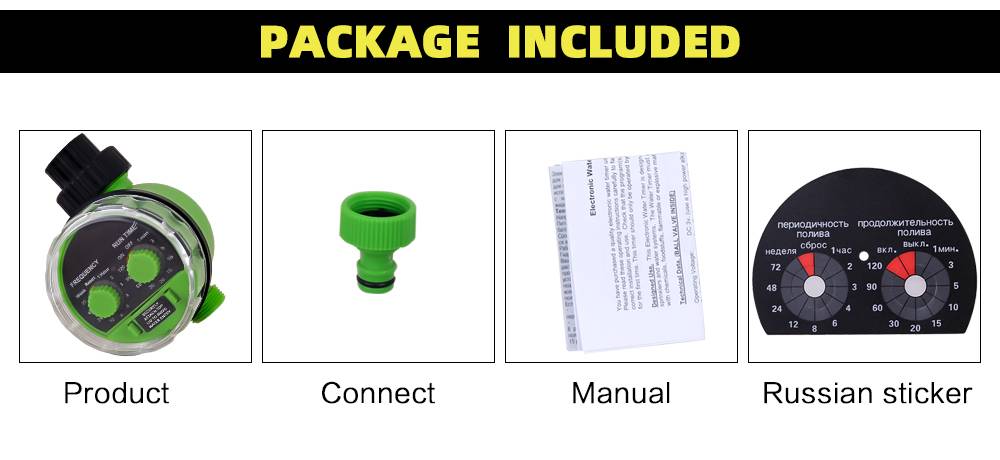 > Питание от аккумулятора (2 х ААА 1,5 В щелочные батареи) (Не прилагаются)> СильныйВнутренний шаровой клапан> Woring давление: от 0 до 8 бар (0-116 PSI)> Рабочая температура: 5-60C(40-140F)> Доступны ручные поливы (вкл/выкл)> Может быть прикреплен к3/4 ''(19 мм)Кран или кран> После установки программы, он будет повторять циклы до новых настроек> Частота: (может быть установлен на 1, 2, 3, 4, 6, 8, 12, 24, 48, 72 H и неделю)> Время работы: (может быть установлен на 1, 3, 5, 10, 15, 20, 30, 60, 90, 120 минут)Примечание: