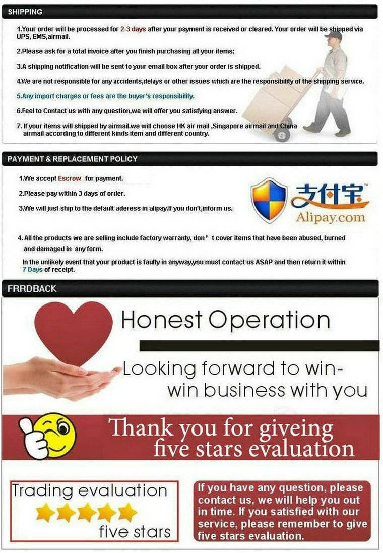 Когда вы получите свои товары, если у вас есть какие-либо вопросы, просто свяжитесь с нами, и мы ответим Вам в течение 24 часов и сделаем все возможное, чтобы сделать для вас. Если у вас есть какие-либо вопросы или проблемы, пожалуйста, не стесняйтесь обращаться к нам, мы всегда стоим за нашими продуктами и предоставим вам лучшие решения.