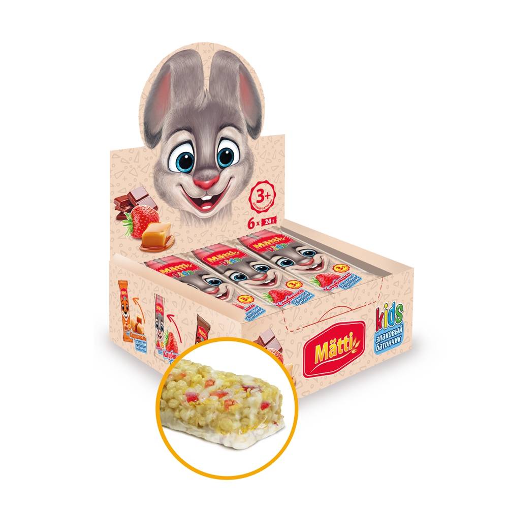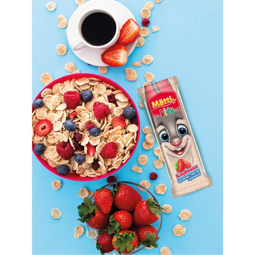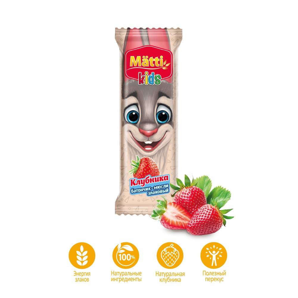 Маленькие любители ягод обязательно оценят клубничный вкус батончика-мюсли Matti Kids с Клубникой. Кусочки спелых ягод обработаны методом бережной сублимации, чтобы сохранить полезные микроэлементы и натуральный вкус. Хрустящая злаковая смесь – естественный источник медленных углеводов, которые прекрасно утоляют голод. Хотите попробовать батончик Matti Kids с Клубникой? Ищите этикетку с белым зайчонком и точно не ошибетесь.