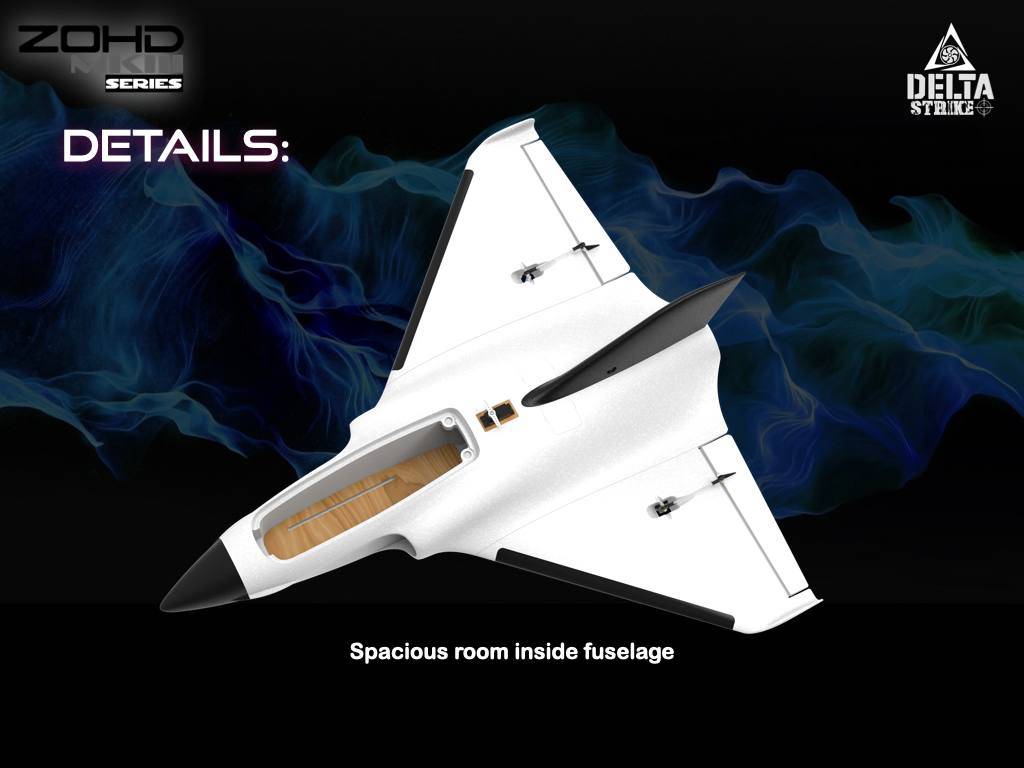 -Просторная комната внутри фюзеляжа для батарей и FPV передач