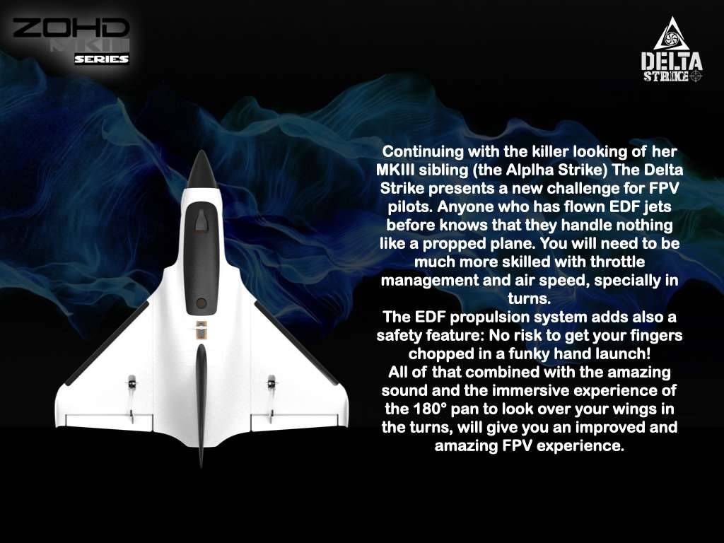 Продолжая наблюдать за тем, как убийца ищет своего «MKII sibling» («Alplha Strike»), Delta Strike представляет новый вызов для пилотов FPV. Любой, кто ранее летал на самолетах EDF, знает, что они не справляются ни с чем, как с самолетом. Вам нужно будет быть гораздо более квалифицированным с управлением дроссельной заслонки и скоростью воздуха, особенно по очереди.