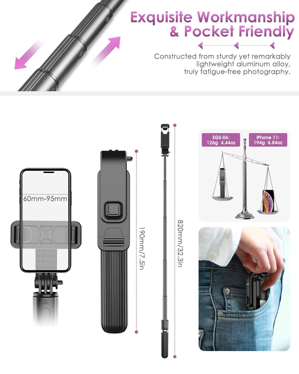 【Все в одном дизайне.】Все в одном селфи-Палка с беспроводным пультом ДУ, который является EGS-06 обновленной версией, легко использовать, когда вы снимаете самофотографии или групповые фотографии, без колебания или наклона, может удерживать тяжелый вес телефона, держите телефон в безопасности, а также позволяет отделить пульт дистанционного управления, Сдвиньте его и управляйте беспроводным затвором, чтобы делать фотографии или записывать видео. Благодаря режиму антивибрационного штатива вы сможете записывать каждый счастливый и значимый момент в вашей жизни.