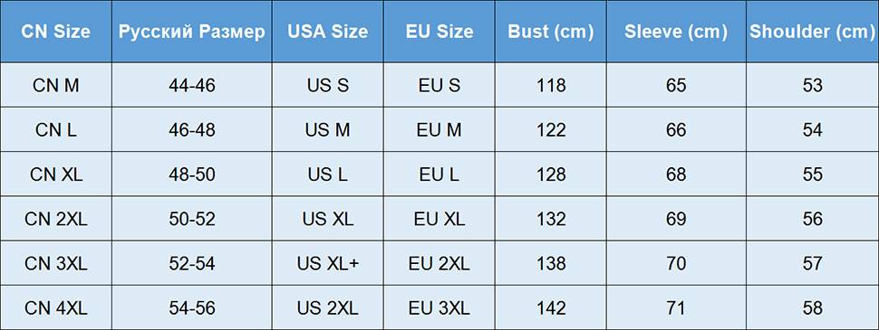 ● По умолчанию указан китайский размер (китайский размер)