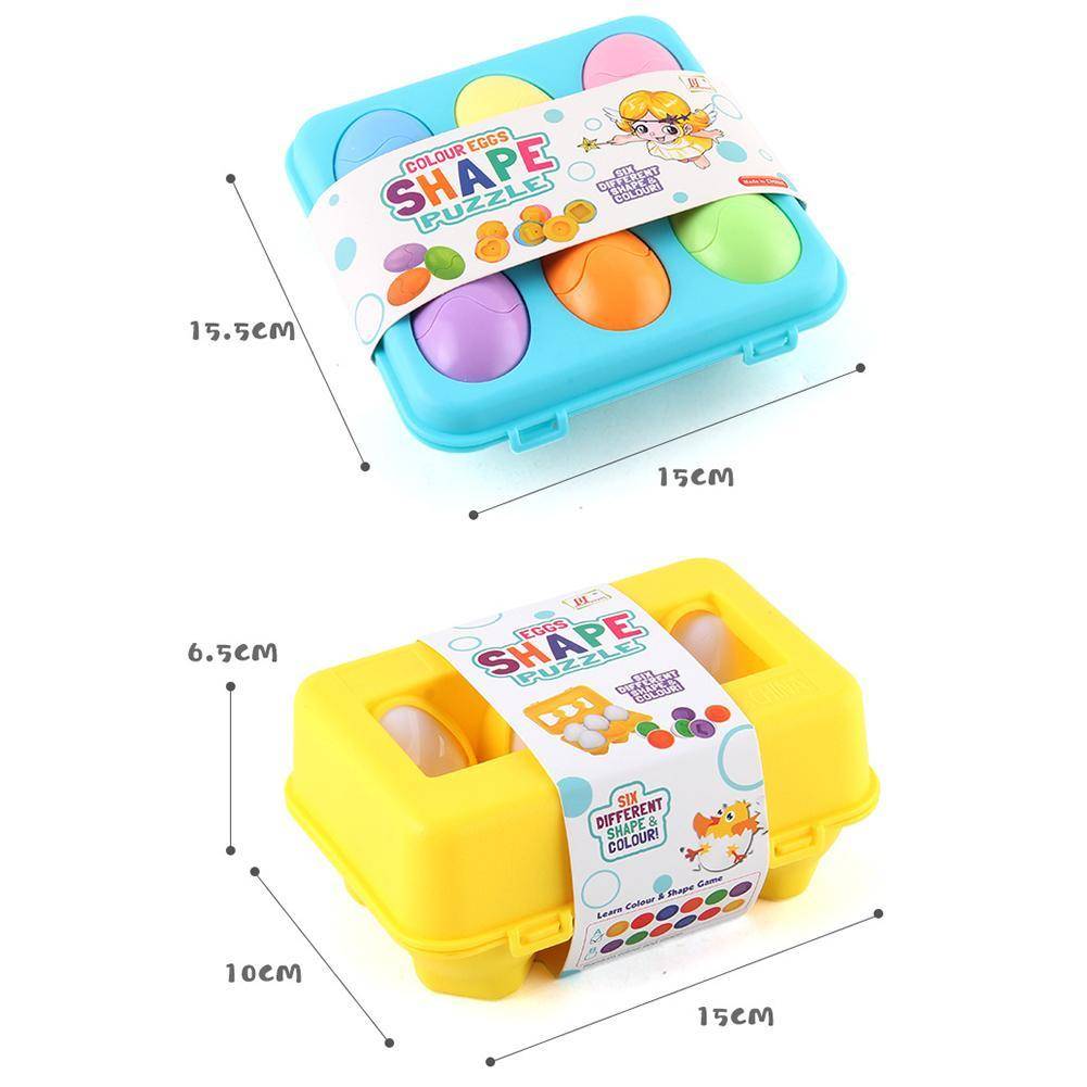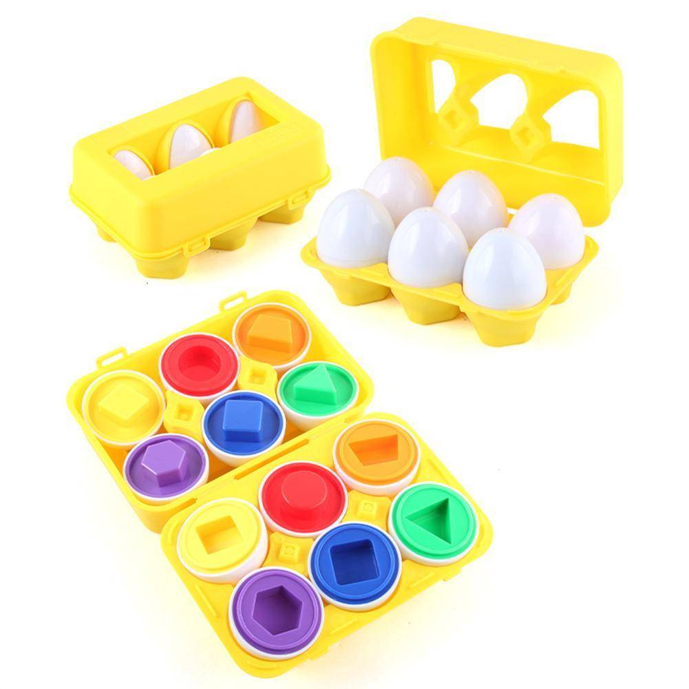 Набор игрушек содержит шесть игрушечных яиц, каждое яйцо имеет разный цвет и разную геометрическую форму посередине.